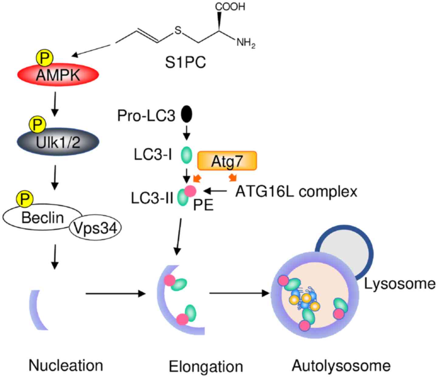 Autophagy is activated by several stress conditions, such as nutrient starvation, unfolded proteins and infection (11–13). Autophagy-mediated proteolysis occurs through different steps, which include the elongation of the phagophore and delivery to lysosomes. These processes are regulated by several signaling molecules (21,22). S1PC has been shown to promote the phosphorylation of AMP-activated protein kinase (AMPK), which is a cellular energy sensor and regulates the initial steps of autophagy activation (10). AMPK triggers the phosphorylation of unc-51-like kinase 1/2 (Ulk1/2) and inhibits the phosphorylation of mammalian target of rapamycin (mTOR), a repressor of autophagy. These steps initiate the elongation of the phagophore by phosphorylating the complex of Beclin1/vesicular sorting protein 34 (VPS34) (21–23). Following the formation of the autophagosome membrane, microtubule-associated protein 1 light chain 3 (LC3-I) conjugates with phosphatidylethanolamine by ubiquitin-like enzymes, such as Atg7, Atg3 and the Atg16L:Atg5-Atg12 complex, and is converted to lipidated LC3 (LC3-II). LC3-II interacts with target proteins via adaptor protein p62 on the autophagosome membrane. The LC3-II/LC3-I ratio usually increases upon the activation of autophagy (24,25), whereas S1PC has been shown to increase the levels of both LC3-I and LC3-II. Accordingly, S1PC can not only promote the conversion of LC3-I to LC3-II, but can also increase the production of LC3-I. Subsequently, the autophagosome fuses with the lysosome and then target proteins are degraded with LC3-II and p62 (10). S1PC has been shown to induce the degradation of target proteins and p62 (10). In addition, both 3-methyladenine (3-MA), an autophagy inhibitor and compound C, an AMPK inhibitor, have been shown to block the S1PC-induced activation of autophagy (10). A schematic diagram of the mechanisms through which S1PC induces autophagy is presented in Fig. 1. It is thus suggested that S1PC triggers the activation of autophagy by inducing AMPK phosphorylation.