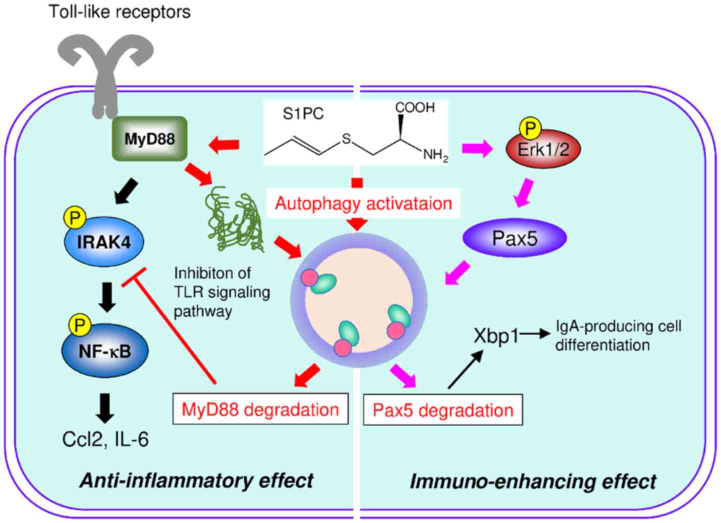 Chronic inflammation is associated with the onset of several human conditions and diseases, including aging, allergies, autoimmune diseases, atherosclerosis, cancer, chronic wounds, cystic fibrosis, metabolic syndrome and obesity (26,27). The pattern recognition receptors (PRRs) play an important role in innate immunity and host defense by recognizing pathogen-associated molecular patterns (PAMPs). However, PRRs trigger chronic inflammation by consecutively interacting with danger-associated molecular patterns (DAMPs) released from dying cells (28–30). Toll-like receptors (TLRs), which are important members of the PRR family, recognize microbial components and cellular debris (28–30). Therefore, PRRs recognize not only pathogens, but also cellular components. The activation of TLRs recruits myeloid differentiation response protein 88 (MyD88), a common adaptor protein of TLRs, apart from TLR3, and IL-1 receptor-associated kinase 4 (IRAK4) to the plasma membrane (30–32). TLR signaling induces the production of the inflammatory cytokines, IL-6 and TNF-α, and the chemokines, C-C motif chemokine ligand 2 (CCL2) and C-X-C motif chemokine ligand 8 (CXCL8) via the activation of nuclear factor (NF)-κB (34,35). S1PC has been shown to inhibit IL-6 production by suppressing the TLR signaling pathway via the degradation of MyD88 (10). In addition, S1PC blocks the mRNA expression of Ccl2 in the livers of spontaneously hypertensive rats (SHRs) (10). A schematic diagram of the mechanisms through which S1PC induces the degradation of MyD88 and paired box protein 5 (Pax5) by activating autophagy is presented in Fig. 2. The constituents of fresh garlic and AGE have been reported to inhibit the TLR signaling pathway. Alliin, a constituent of fresh garlic, decreases the LPS-induced phosphorylation of extracellular signal-regulated kinase (ERK)1/2 in adipocytes (36). S-allylcysteine (SAC), a constituent of AGE, has been shown to reduce the production of inflammatory cytokines by inhibiting NF-κB phosphorylation (37). The inhibitory effects of S1PC could be considered to be different from those of other garlic constituents. S1PC has been shown to degrade MyD88 by activating autophagy (see schematic diagram in Fig. 2) (10). However, the activation of autophagy alone cannot degrade MyD88 due to the inability of SAC to induce the degradation of MyD88, although SAC also activates autophagy (10). S1PC has been shown to have another distinct feature that directly denatures and aggregates MyD88, whereas SAC is unable to denature MyD88 (10). Aggregated MyD88 is modified with both acetylation and ubiquitination, and forms the histone deacetylase 6 (HDAC6)-dependent aggresome. Subsequently, ubiquitin of the aggresome interacts with p62 and is degraded by the autophagy-lysosome system (10). Thus, as discussed above, it has been suggested by both in vitro and in vivo studies that the anti-inflammatory mechanisms of S1PC involve the degradation of MyD88 by triggering the denaturation of MyD88 and the activation of autophagy.