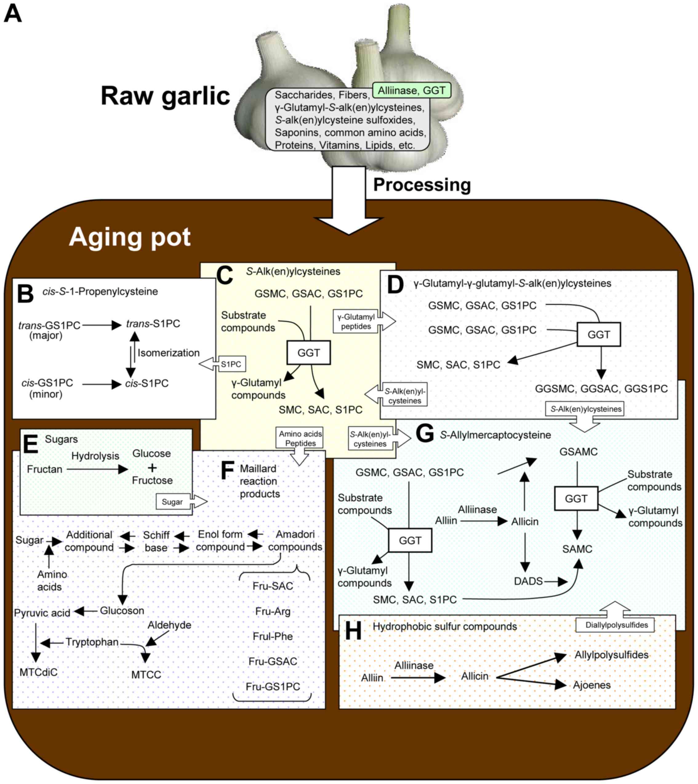 Fujii T, Matsutomo T and Kodera Y: Changes of S-allylmercaptocysteine and γ-glutamyl-S-allylmercaptocysteine contents and their putative production mechanisms in garlic extract during the aging process. J Agric Food Chem. 66:10506–10512. 2018. View Article : Google Scholar : PubMed/NCBI | |