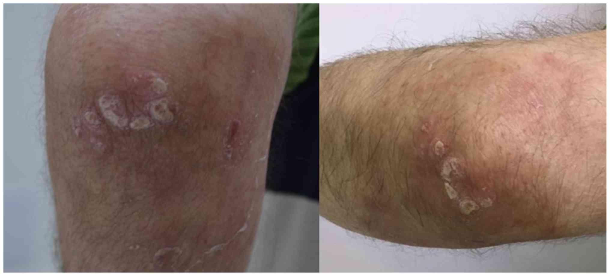 We present the case of a 62-year old, male patient, which was referred to our clinic due to presence of widespread, sharply demarcated, erythematous plaques, with adherent silvery white scales on the surface of the lesions, irregularly shaped, ranging from 4 to 8 cm, localised symmetrically on the elbows. The lesions had a tendency to coalesce into larger plaques (Fig. 1).