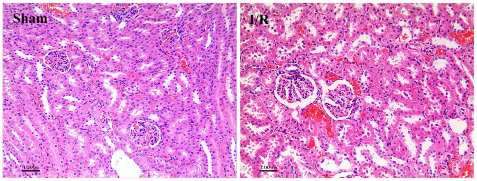As shown in Fig. 1, the results of HE staining showed the structure of renal tissue. The sham group was normal and only local renal tubular epithelial cell degeneration was observed. Serious tubular epithelial cell swelling, vacuolar degeneration, deep nuclear staining, cell necrosis, damaged basement membrane and renal tubular lumen expansion were observed in I/R groups, indicating the successfully constructed I/R model.