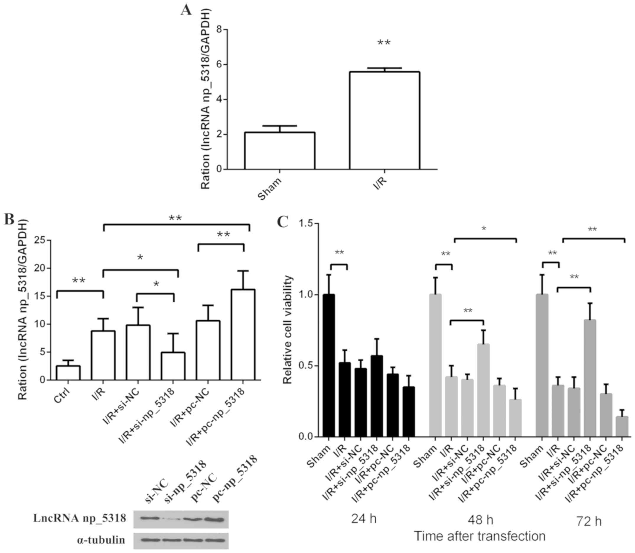 Vector pc-np_5318 for overexpression of lncRNA np_5318 in I/R cell was constructed by inserting the coding oligonucleotides of lncRNA np_5318 into a pcDNA3.1 vector (Invitrogen: Thermo Fisher Scientific, Inc.). Small interfering (si)RNAs targeting lncRNA np_5318 (si-np_5318) were constructed for inhibition of lncRNA np_5318. For cell transfection, I/R cells as mentioned before were cultured in a six-well plates (105 cells per well) for 24 h and transfected with 10 nM pc-np_5318, si-np_5318 (5'-CCUGUGCACGUUCGAUUCAUA-3'), and their corresponding controls [pc-NC and si-NC (5'-GCGUGACGUACGUACGUACGA-3') respectively] using Lipofectamine 2000® reagent (Invitrogen; Thermo Fisher Scientific, Inc.). Cells continued to be incubated for another 48 h before subsequent experiments.