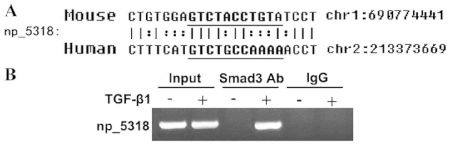 As shown in Fig. 3A, np_5318 contained conserved Smad3 binding sites in both human and mouse genomes. To confirm this finding, a ChIP assay was used to determine the interaction of Smad3 with the promoter regions of np_5318 in mouse embryonic fibroblast. The antibody against Smad3 could successfully immunoprecipitate the DNA fragments from MEFs containing the potential SBSs in the promoter regions of np_17856 and np_5318, supporting that Smad3 could physically interact with their promoter regions (Fig. 3B).
