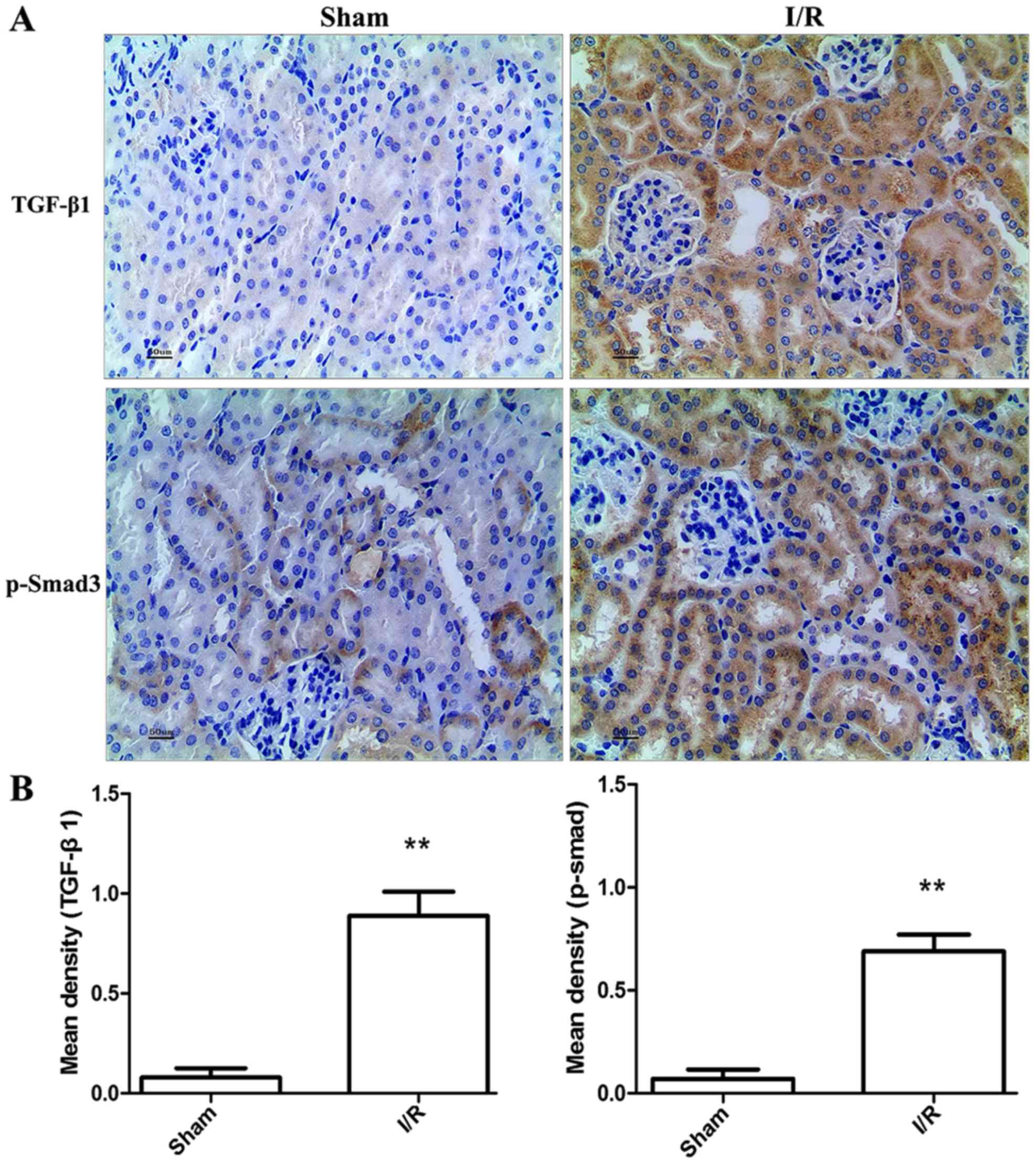 To determine TGF-β1 and p-Smad3 expression in the kidney, immunohistochemical staining was performed. The sham operated controls did not show any TGF-β1 and p-Smad3 expression. However, there was significant increase in TGF-β1 and p-Smad3 expression in I/R model (P<0.01) compared with the sham mice (Fig. 4). Levels of TGF-β1, Smad3 and p-Smad3 were also detected by western blotting in the renal tissue of the different groups. As shown in Fig. 5A and B, compared with the sham group, levels of TGF-β1, Smad3 and p-Smad3 were significantly increased in renal tissue of I/R group (P<0.001).
