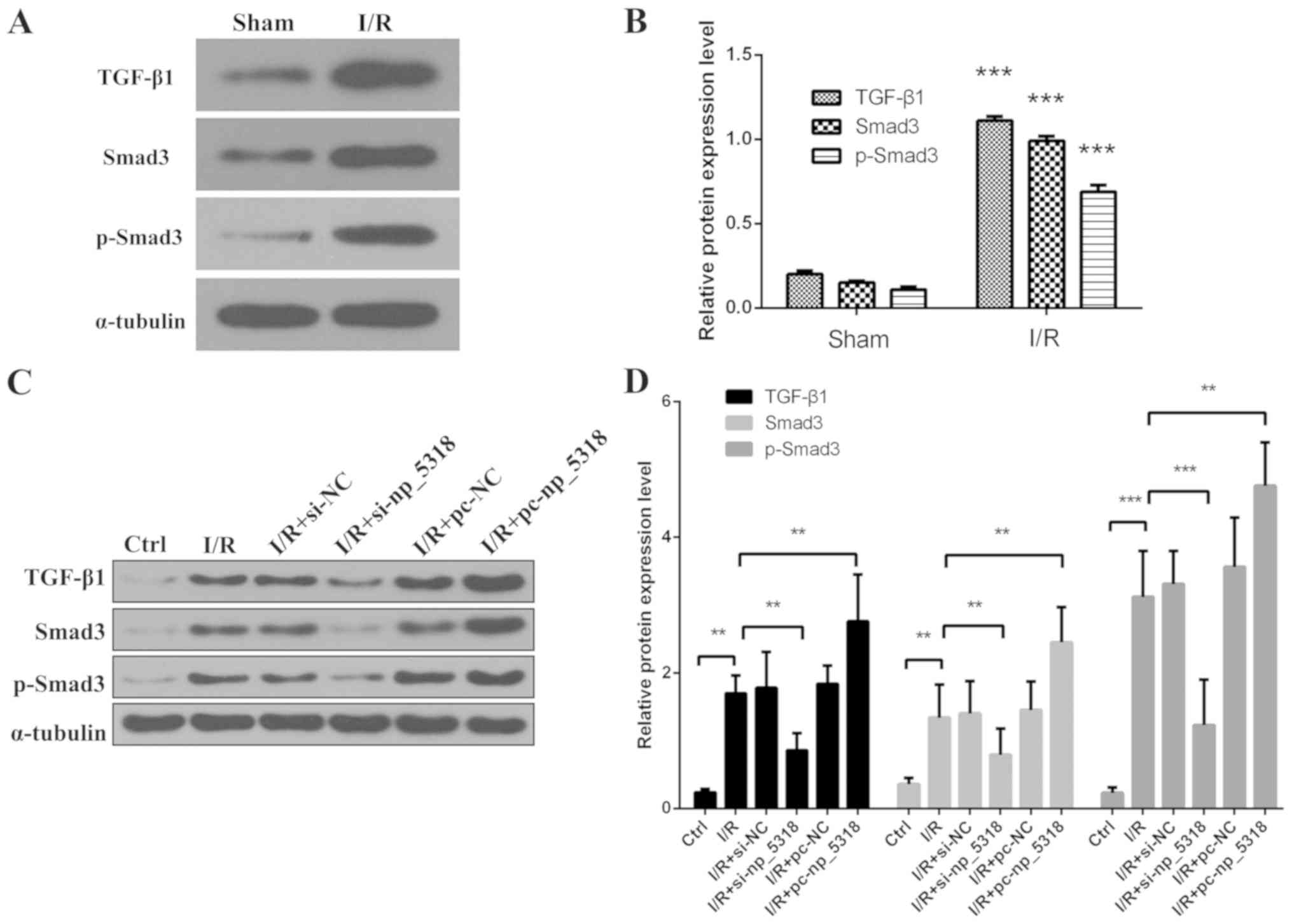 Then levels of TGF-β1, Smad3 and p-Smad3 in cells were detected by western blotting, including I/R, I/R+si-NC, I/R+si-np_5318, I/R+pc-NC, I/R+pc-np_5318, and the control groups as shown in Fig. 5C and D. It was demonstrated that the level of TGF-β1, p-Smad3 and Smad3 was significantly increased in I/R group compared with the control group, and transfection with pc-np_5318 significantly increased the level of np_5318 compared with in the I/R group. While inhibition of np_5318 by si-np_5318 significantly suppressed the level of TGF-β1, p-Smad3 and Smad3 compared with the I/R group. Those data suggest that I/R can increase the expression levels of TGF-β1, Smad3 and p-Smad3.