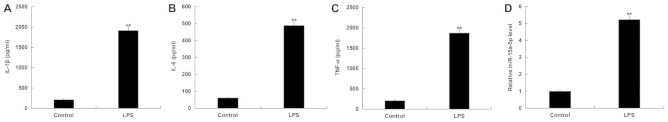 After RAW264.7 macrophages were stimulated with LPS for 4 h, the expression levels of miR-15a-5p and inflammatory factors were detected by RT-qPCR and ELISAs, respectively. IL-1β, IL-6 and TNF-α levels were detected to evaluate the inflammatory response. The results indicated that the expression levels of IL-1β, IL-6 and TNF-α were significantly increased in RAW264.7 macrophages after treatment with LPS compared with the control group (Fig. 1A-C). Additionally, the data showed that the expression level of miR-15a-5p was increased with LPS stimulation (Fig. 1D).