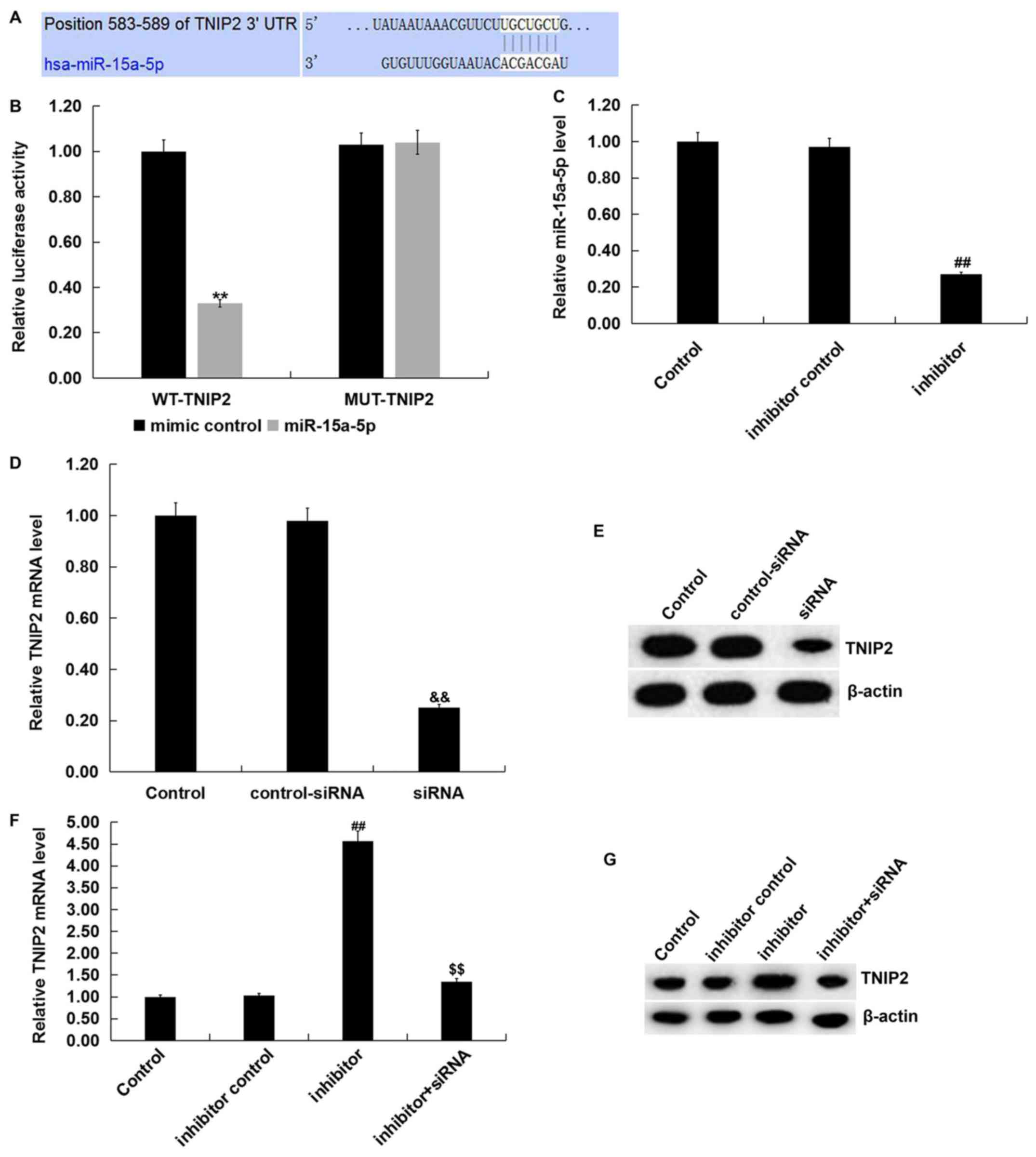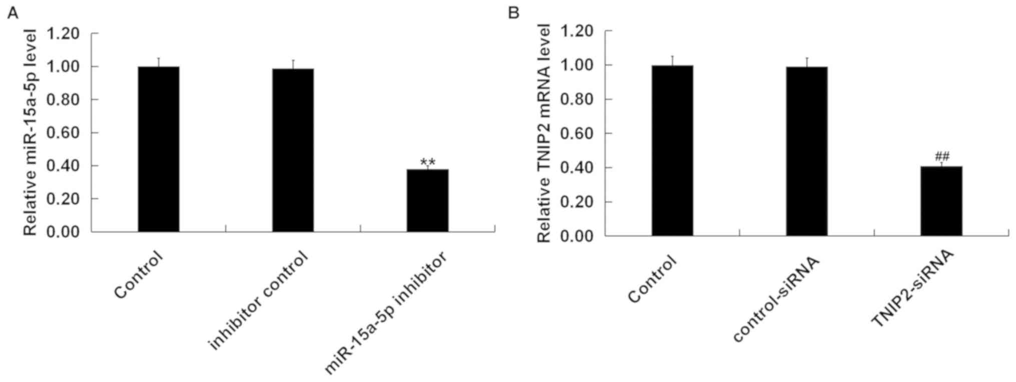 Prior to transfection, cells were changed to antibiotic-free media for 24 h, then RAW264.7 macrophage cells (5x104 cells per well) were transfected with 0.2 µM control-siRNA (cat. no. sc-36869; Santa Cruz Biotechnology, Inc.), 0.2 µM TINP2-siRNA (cat. no. sc-44638; Santa Cruz Biotechnology, Inc.), 100 nM inhibitor control (Shanghai GenePharma Co., Ltd.; 5'-CAGUACUUUUGUGUAGUACAA-3'), 100 nM miR-15a-5p inhibitor (Shanghai GenePharma Co., Ltd.; 5'-CACUGGUACAAGGGUUGGGAGA-3') or 100 nM miR-15a-5p inhibitor + 0.2 µM TNIP2-siRNA using Lipofectamine® 2000 reagent (Invitrogen; Thermo Fisher Scientific, Inc.), according to the manufacturer's protocol. The efficiency of cell transfection was measured using reverse transcription quantitative-PCR (RT-qPCR) and western blot assays with samples collected 48 h after cell transfection. Cells without any treatment were used as the control.