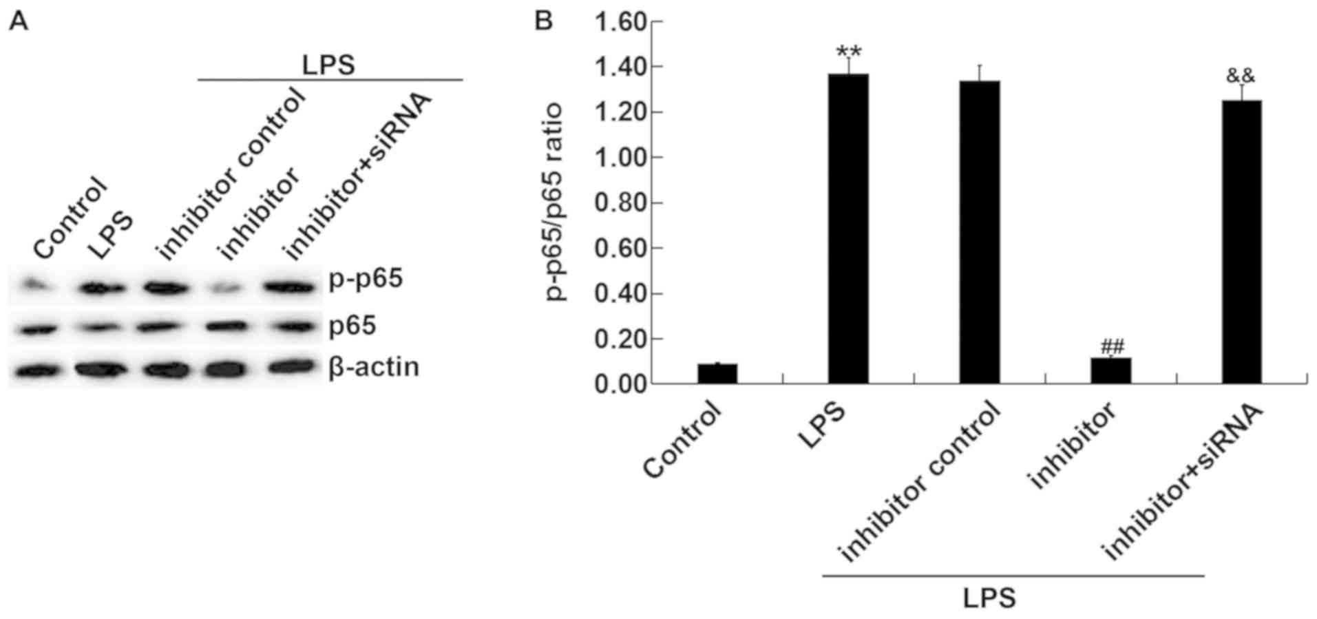 The effect of miR-15a-5p inhibitor on LPS-induced NF-κ activation was subsequently examined. After transfecting RAW264.7 macrophages with miR-15a-5p inhibitor or miR-15a-5p inhibitor + TNIP2-siRNA for 48 h, LPS was used to stimulate the cells for 4 h. As indicated in Fig. 5, the protein expression levels of p-p65 were enhanced in the LPS treatment group compared with the control group (Fig. 5A and B). Compared with the LPS + inhibitor control treatment group, miR-15a-5p inhibitor significantly inhibited the expression of p-p65 in LPS-treated cells, whereas TNIP2 downregulation reversed these effects. These data suggested that miRNA-15a-5p was involved in inflammatory progression by regulating the activation of the NF-κ pathway and by targeting TNIP2 in vitro.