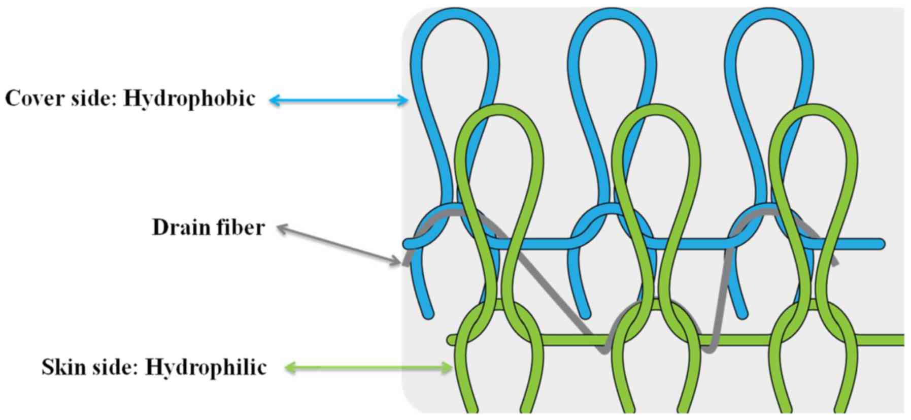 With the aim of overcoming current limitations in transdermal delivery systems, the present study developed a novel fabric for transdermal drug delivery and evaluated its ability to enhance the effect of slimming creams. The novel fabric used in the present study consisted of two layers, an outer hydrophobic layer of polypropylene and an inner hydrophilic layer of nylon with polyurethane. This fabric creates a unique combination of conditions at the skin surface in which the hydrophobic outer layer prevents water evaporation and thus puts water in direct contact with the skin, whereas the hydrophilic layer, which is also in direct contact with the skin, maintains skin moisture (Fig. 1). Therefore, the aim of the present study was to evaluate the efficacy of this novel fabric for the enhancement of a transdermal drug delivery system in vivo and in vitro.