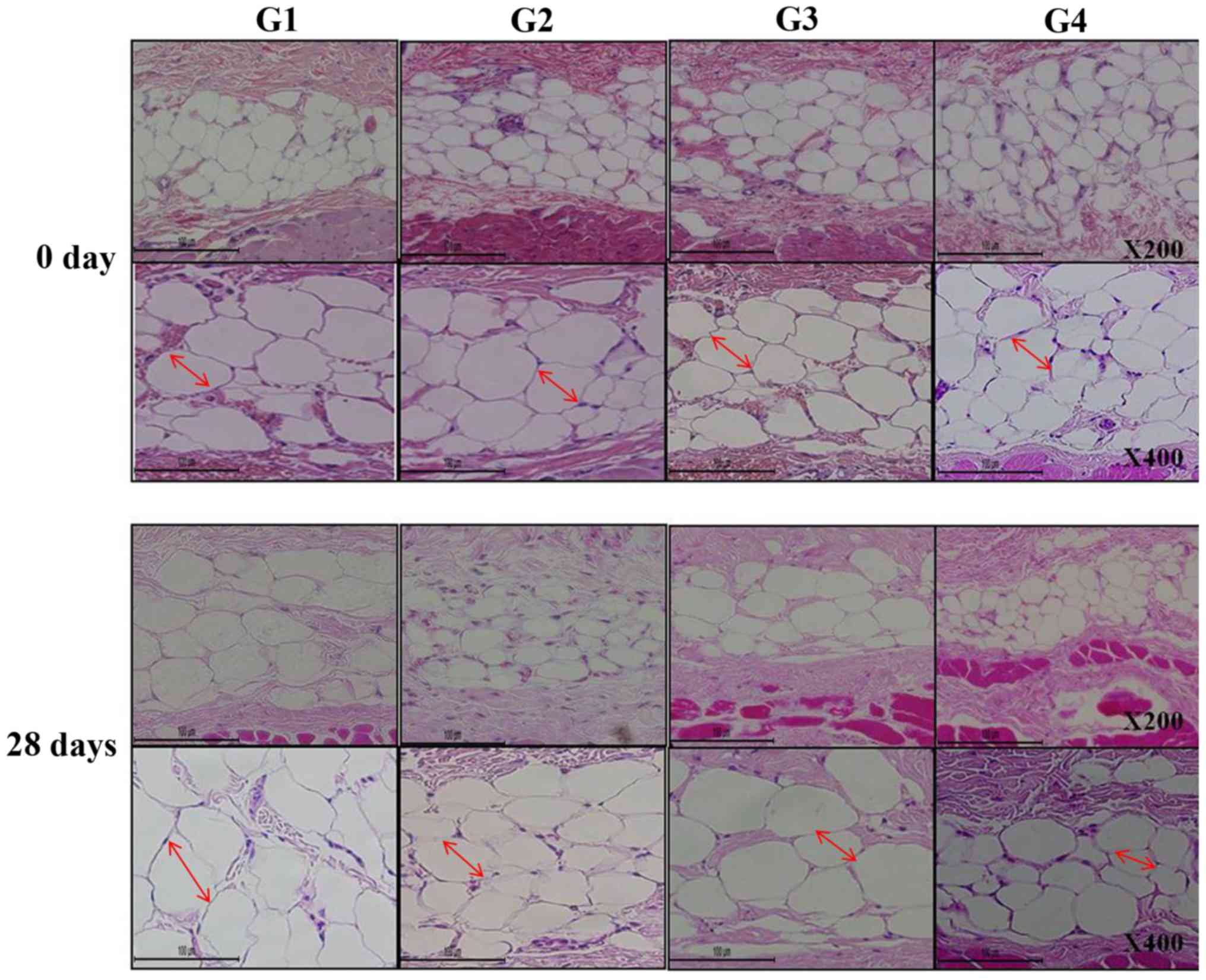 After an acclimation period of 7 days, guinea pigs with a healthy appearance (no abnormal eye movements) were randomly allocated into four groups (n=3) as follows: i) Group 1, untreated control; ii) group 2, topical cosmetic slimming cream alone (Hera Glam Body Slite®; Amorepacific Co.); iii) group 3, slimming cream with normal fabric (made of 100% cotton), and iv) group 4, slimming cream with the novel drug delivery fabric (Doctor Slim®; Ventex). After all treatments, to take skin samples, guinea pigs were anesthetized using an intramuscular injection of a mixture of ketamine HCL (45 mg/kg of body weight; Ketalar; Yuhan Co., Ltd.) and xylazine (5 mg/kg; Bayer AG). All animals were euthanized using exsanguination immediately after terminal CO2 or ketamine HCL-xylazine administration on days 0 and 28.