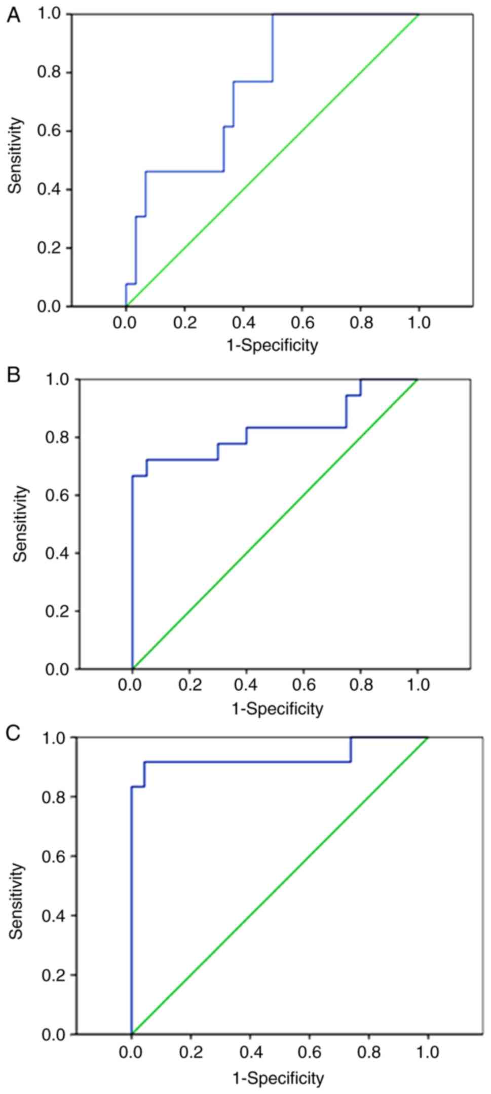 ROC curve analysis suggested that the AUC for APACHE II scoring, which is used for the diagnosis of HTGAP, was 0.759 with 85.3% sensitivity and 82.1% specificity (Fig. 4A). Furthermore, the miR-372 expression levels for the diagnosis of HTGAP displayed an AUC of 0.831 with 86.7% sensitivity and 79.5% specificity (Fig. 4B). The AUC for the combined use of the APACHE II scoring system and miR-372 expression levels was 0.935 with 89.5% sensitivity and 87.61% specificity (Fig. 4C).