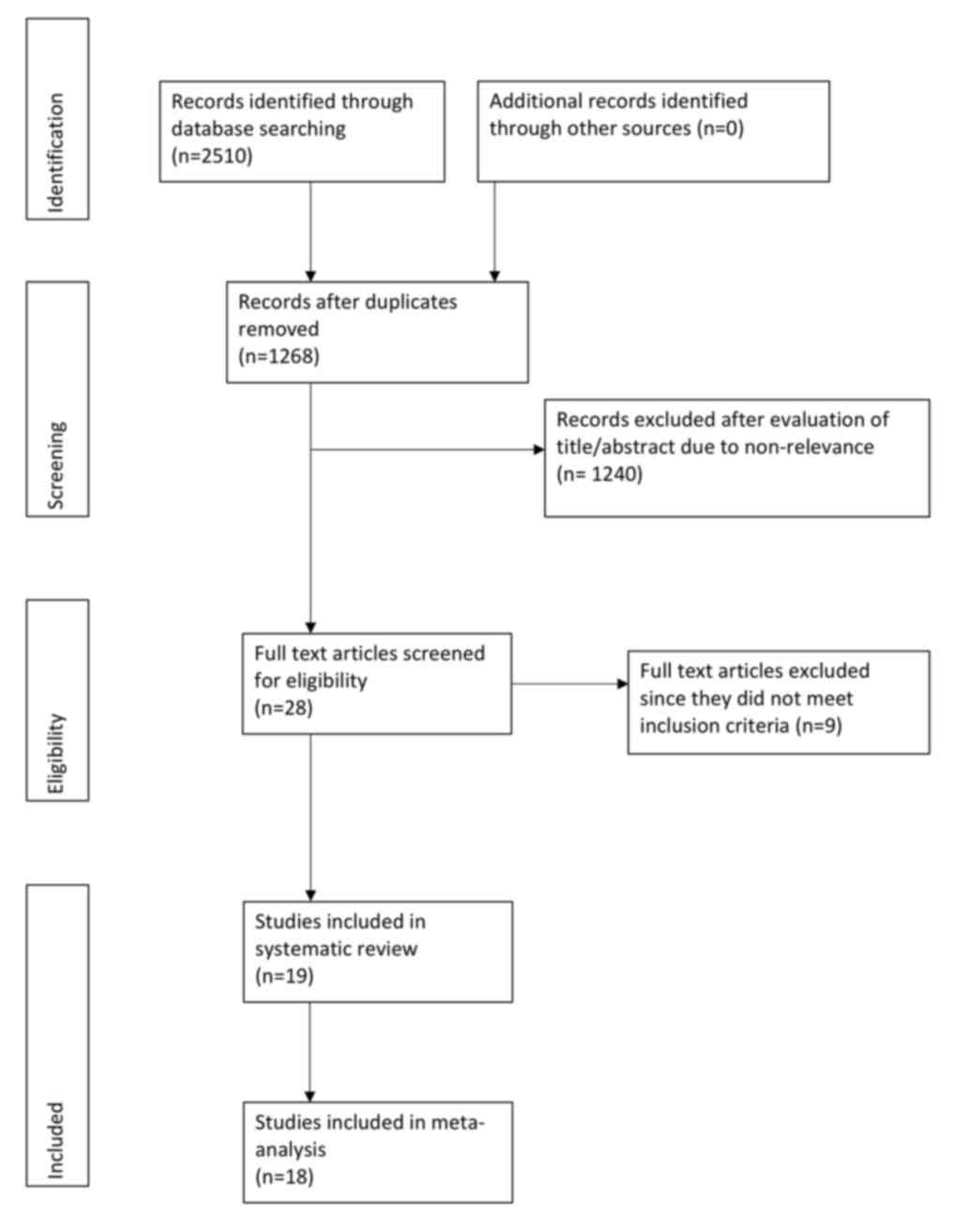 A total of 2,510 relevant entries were initially identified using the search strategy (Fig. 1). Of these, 28 articles were eligible for full-text review. Subsequently, 9 studies were excluded as 2 were duplicate publications (15,16), 2 studies did not report cephalometric data (17,18), mean and SD scores of cephalometric variables were not available in 1 study (19), orthodontic treatment was ongoing in 1 study (20), only soft tissue cephalometric variables were studied in 1 article (21), 1 study did not have a control group (5) and 1 study included adult participants as well (22). A total of 19 articles were finally included (3,4,6-10,23-34).