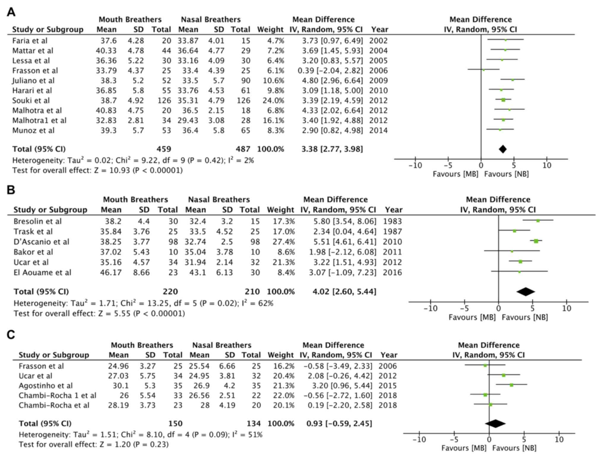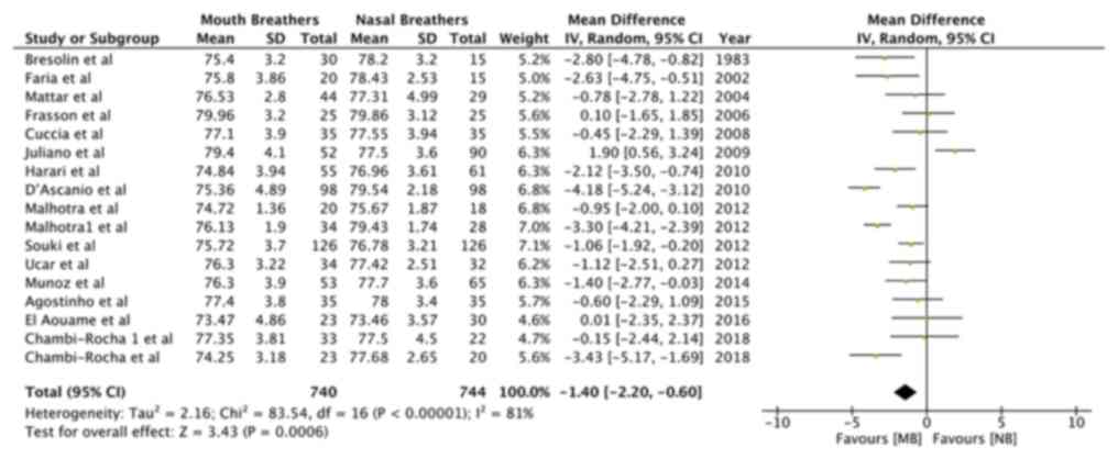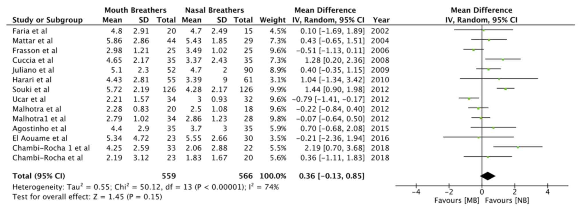 In terms of facial morphology, mouth breathers are expected to have a vertical growth pattern. The results of the present analysis tend to support this assumption. Comparisons of mandibular plane angles between mouth breathers and nasal breathers were provided by 17 studies. Since 3 different angular measurements (SN.GoGn, FMA and SN.MP) were utilized, data were pooled separately for each variable. The meta-analysis indicated a statistically significant increase in mandibular plane angles (SN.GoGn and SN.MP) in mouth breathers. Only 4 studies, namely those of Frasson et al (10), Bakor et al (3), Chambi-Rocha et al (30) and El Aouame et al (29), did not obtain any difference in the mandibular plane angle between the two groups. In the study by Bakor et al (3), the non-significant result was probably due to the small sample size of the study. The study by El Aouame et al (29), despite no significant difference in mandibular plane angles, concluded that a hyperdivergent growth pattern prevails in mouth breathers as compared to nasal breathers.