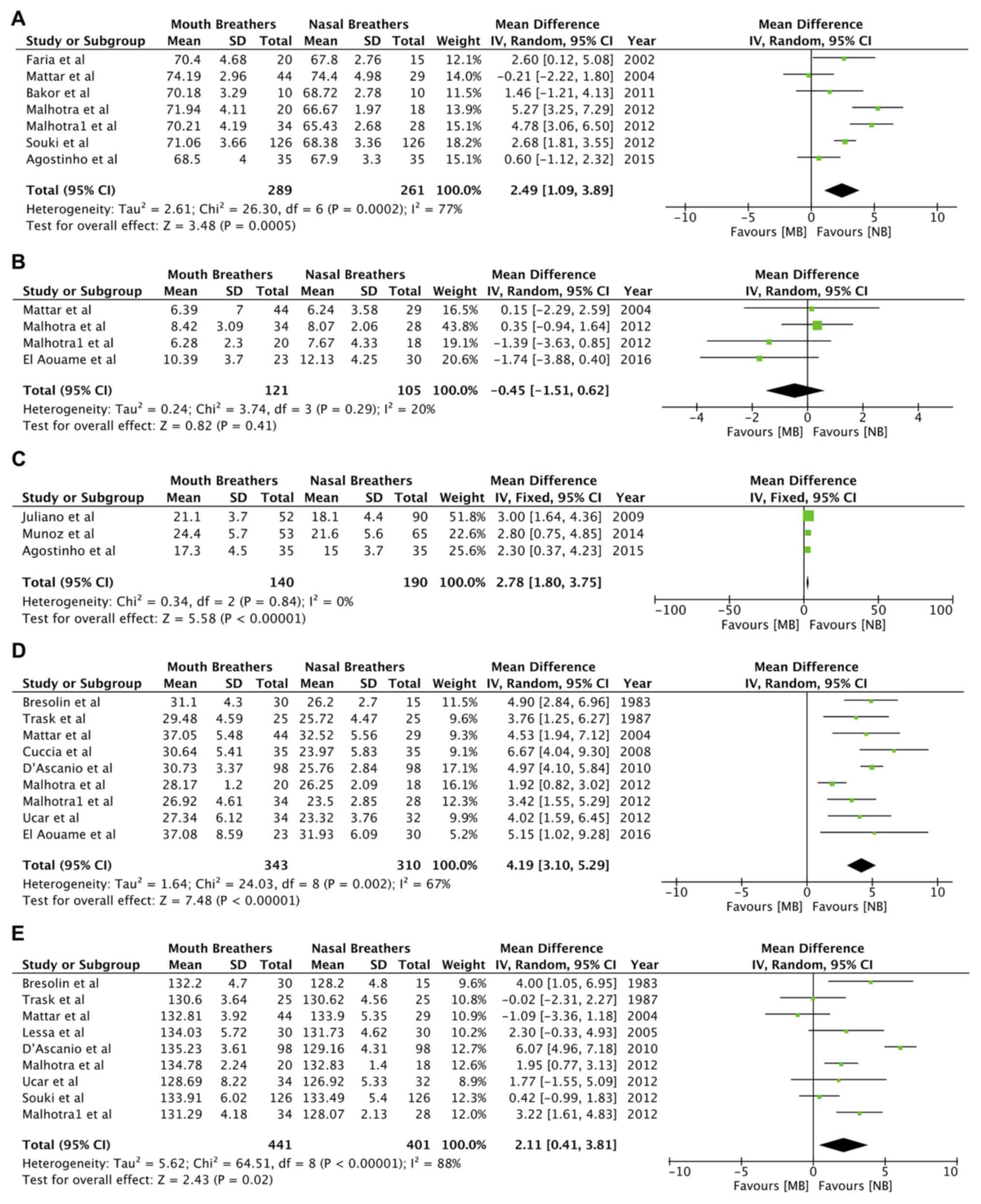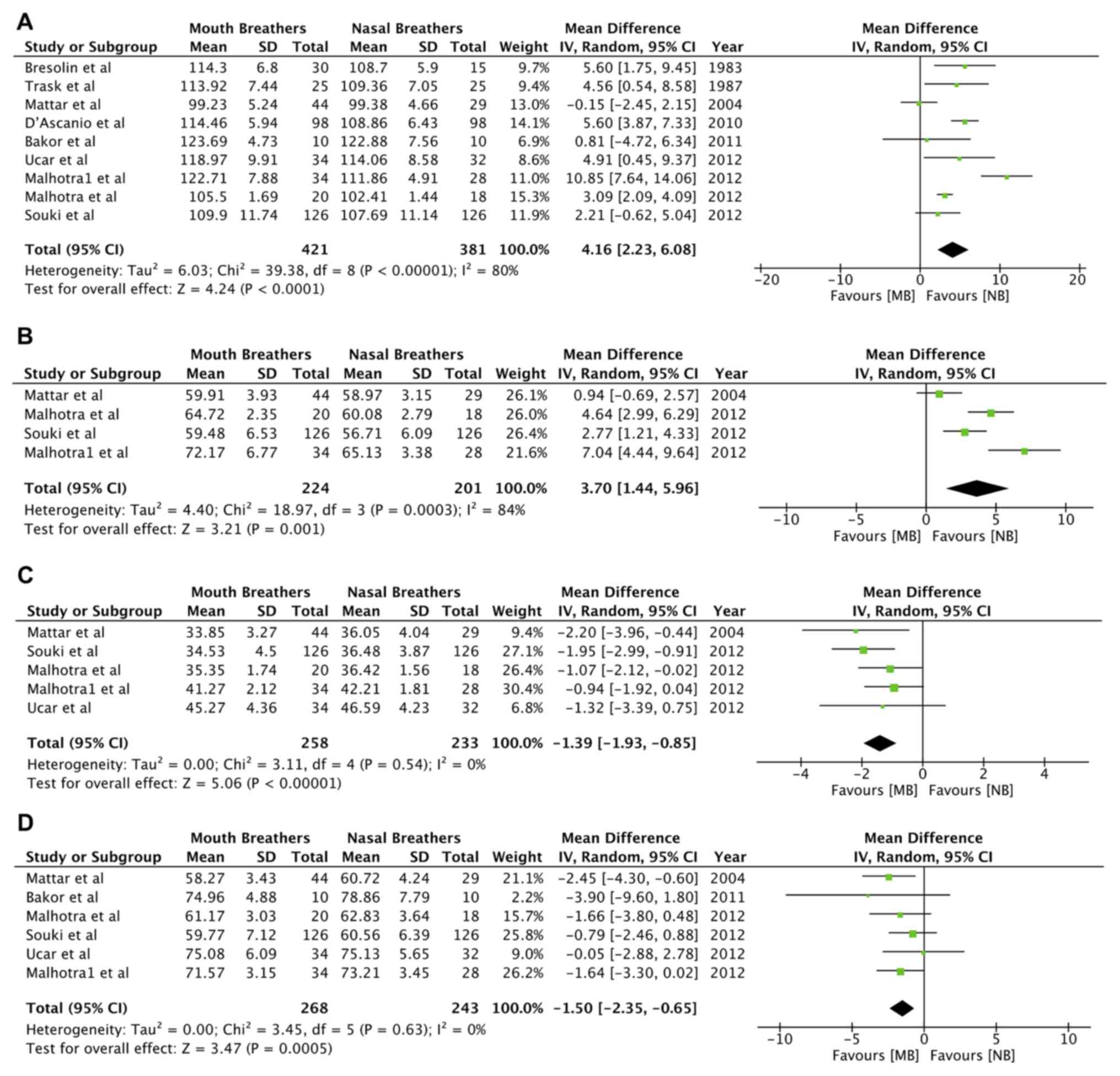 The primary objective of the present review was to evaluate facial morphological differences in mouth-breathing children and adolescents as compared to age and gender-matched control groups of nasal breathers. Considering the multiple different angulars and linear measurements evaluated by the studies included, it was not possible to pool all variables for a meta-analysis. The variables used in the present meta-analysis may be broadly divided as follows: Those measuring the association of maxilla and mandible to the cranial base (SNA and SNB) and each other (ANB), mandibular plane angles (SN.GoGn, FMA and SN.MP), Y-axis angle (NSGn), association of occlusal and palatal planes to the cranial base and mandible (SN.OP, SN.MP and MP.PP), the gonial angle (ArGoMe) and anterior and posterior facial height measurements (N-Me, ANS-Me, Ar-Go and S-Go).