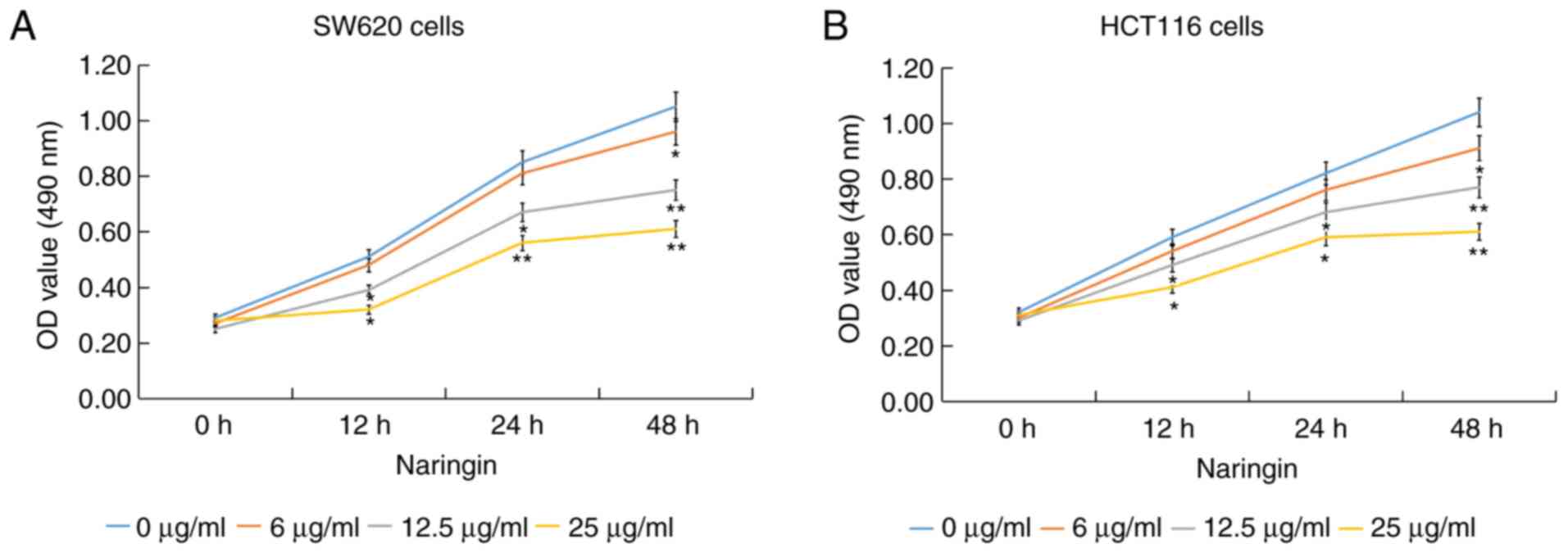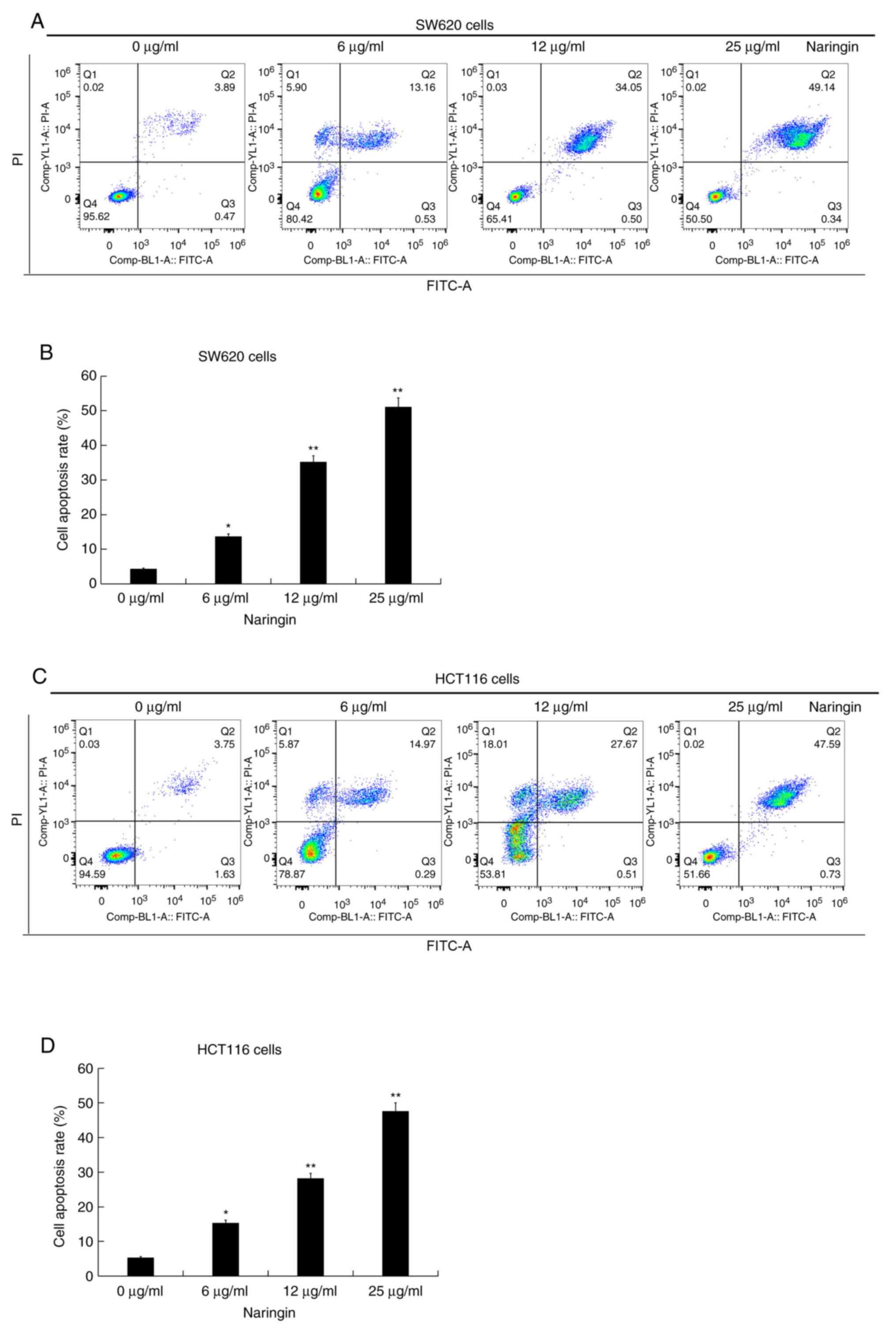 Naringin was the compound of focus in the present study. MTT assays were used to detect the proliferation rate of CRC cells treated with naringin. Naringin was found to effectively inhibit CRC cell proliferation in both HCT116 and SW620 cells. Similarly, naringin demonstrated both time- and dose-dependent significant effects on proliferation. Combined with flow cytometry results examining the rate of apoptosis in CRC cells, it was found that naringin had a dose-dependent effect on the apoptosis of CRC cells, with higher doses causing an increase in the extent of apoptosis.