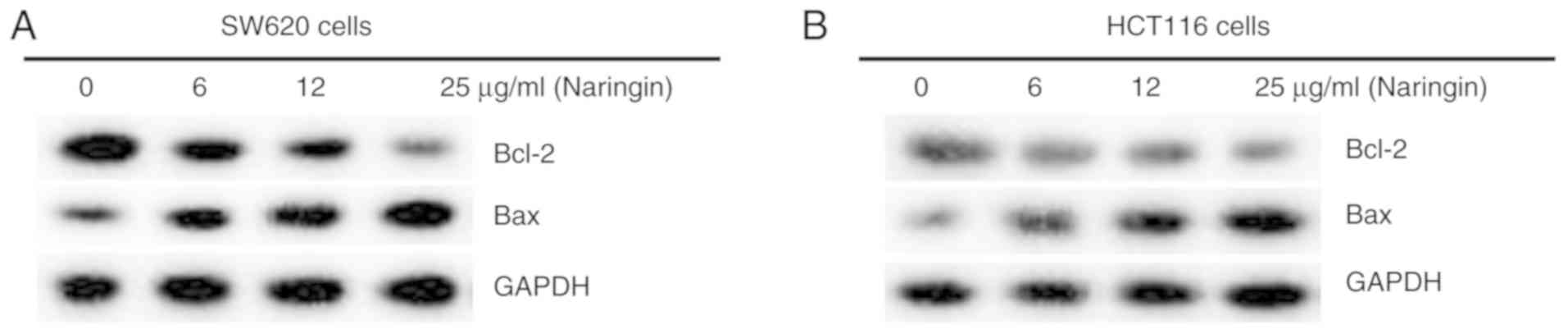 It was demonstrated that naringin had an effect on apoptosis in CRC cells. The results of the apoptosis assay showed that naringin promoted the apoptosis of SW620 (Fig. 3A and B) and HCT116 cells (Fig. 3C and D). There also appeared to be a positive association between the concentration of naringin and the extent of apoptosis. Combined with the results of the western blot assays, this conclusion was further verified. The results of the western blot assays demonstrated that naringin effectively reduced the expression levels of Bcl-2, an inhibitor of apoptosis. Naringin also increased the expression levels of Bax, a pro-apoptotic protein, in SW620 (Fig. 4A) and HCT116 cells (Fig. 4B).