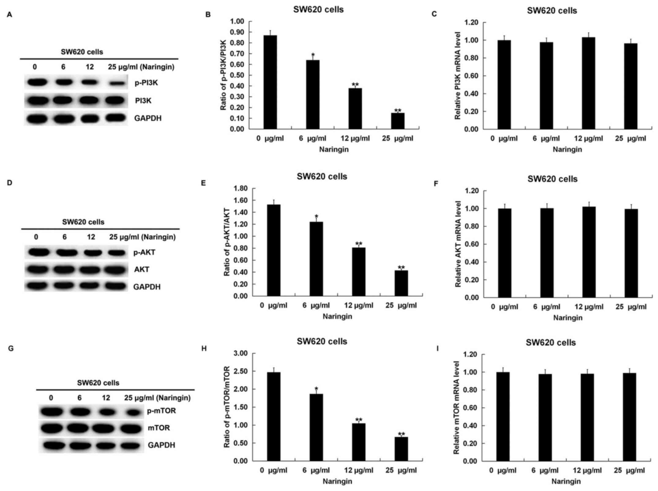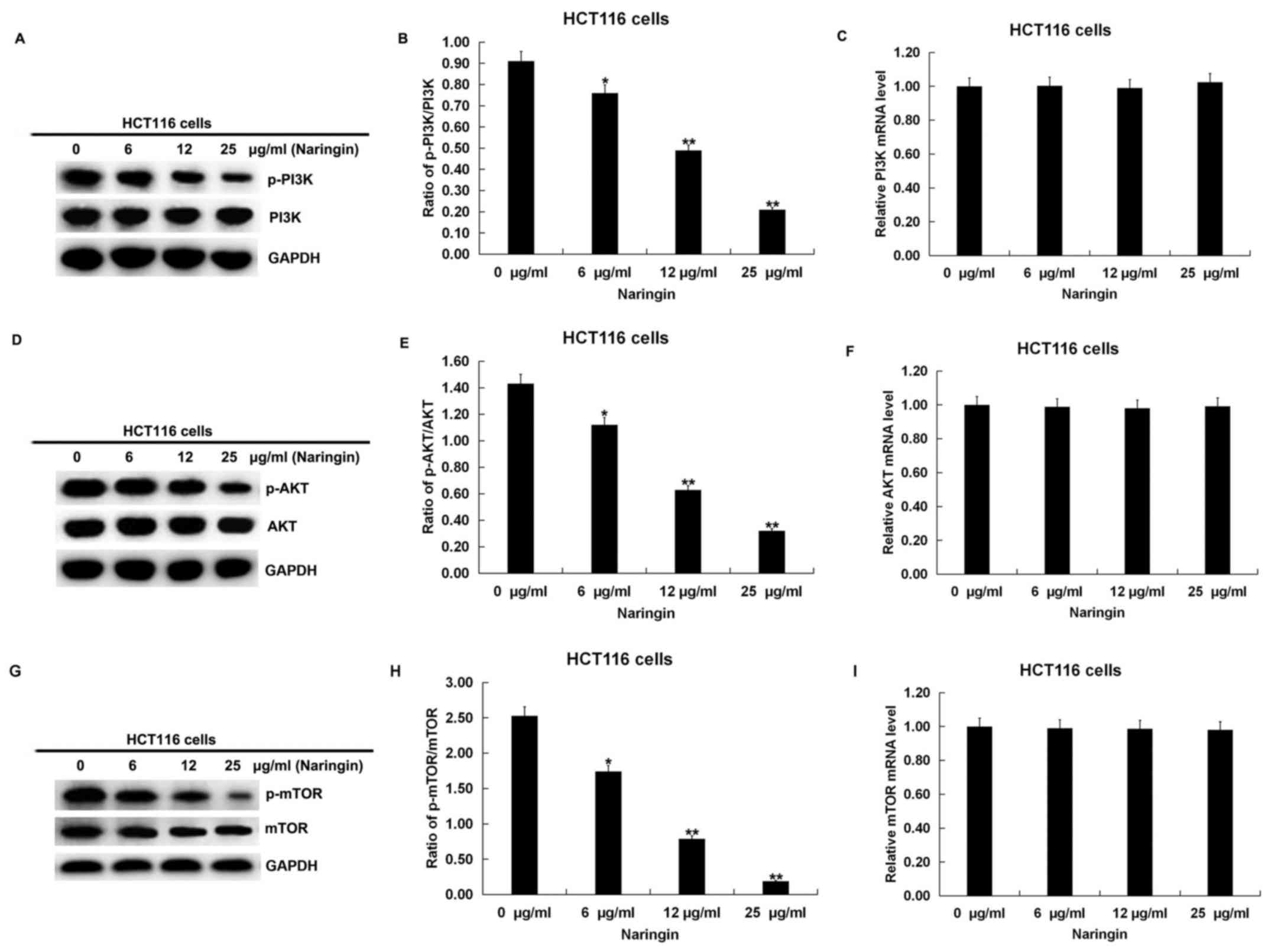 Based on these findings, this present study aimed to investigate whether naringin could inhibit the proliferation of CRC cells by inhibiting the PI3K/AKT/mTOR signaling pathway, so as to potentially provide a more mechanisms-based treatment for CRC.