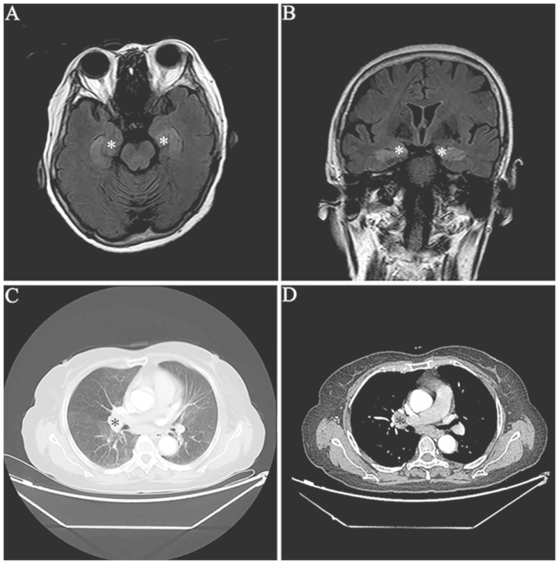 Anti-GABAB receptor encephalitis is a relatively rare disease: Only 100 cases have been reported in the literature since 2010 (4-9). In addition, ~1/2 of patients with antibodies against GABAB receptor encephalitis have small cell lung cancer (SCLC). The majority of patients exhibit neurological improvement after immunotherapy and tumor therapy (4-9).