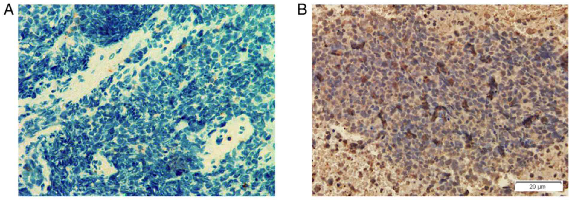 Anti-GABAB receptor in the tumor tissues were evaluated by immunohistochemical staining with specific antibodies. After deparaffinization in xylene and graded alcohol concentrations, endogenous peroxidase was blocked in 0.3% hydrogen peroxide. Non-specific binding was blocked by incubation in 10% bovine serum albumin (Sigma Aldrich; Merck KGaA). Sections were incubated with primary polyclonal antibody against human GABAB receptor (cat. no. sc-393270; 1:200 dilution; Santa Cruz Biotechnology, Inc.). A horseradish peroxidase-labeled secondary antibody (cat. no. sc-2005; 1:500 dilution; Santa Cruz Biotechnology, Inc.) was then added. The slides were stained with diaminobenzidine and then counterstained with hematoxylin. The stained slides were dehydrated and observed under a microscope. In total, lung cancer tissues from three patients were stained. The lung cancer tissues from one other patient who had SCLC without the manifestations of anti-GABAB receptor encephalitis was also stained and used as a control.