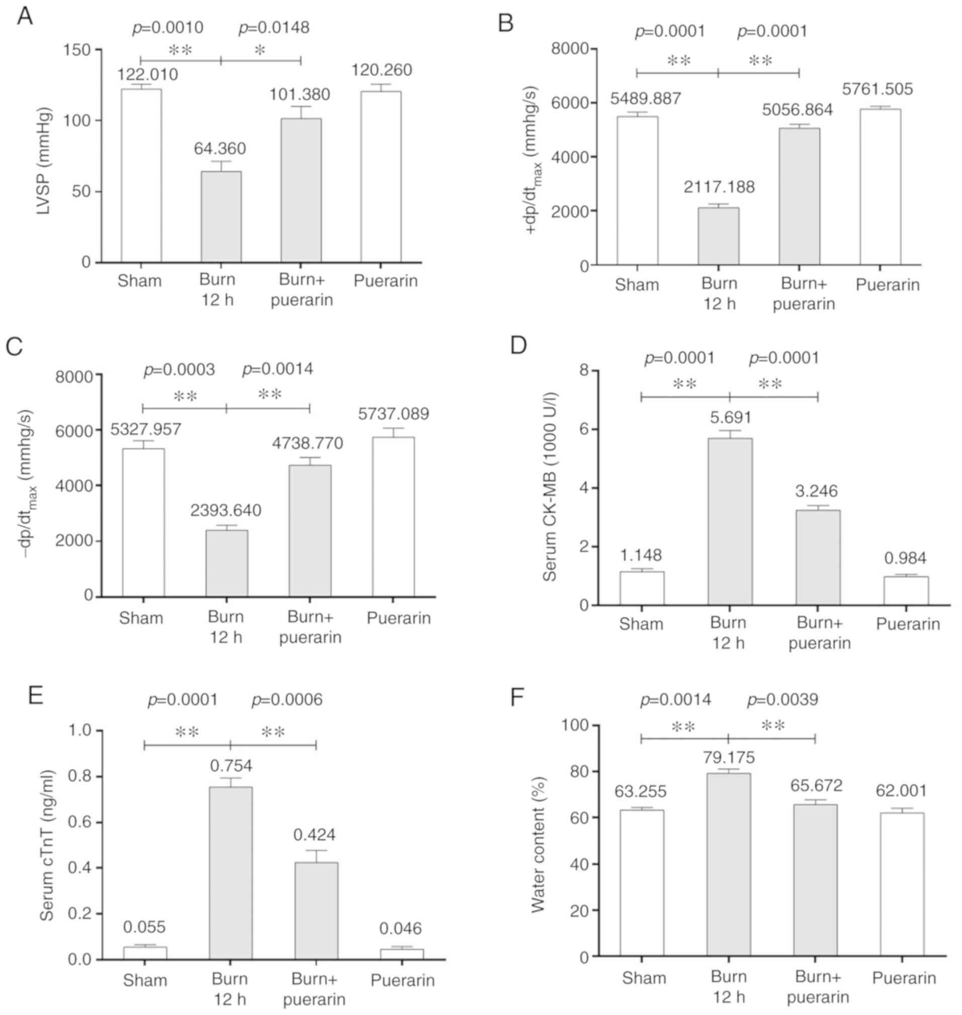 LVSP and dp/dtmax, which directly reflect cardiac function, were significantly reduced 12 h after severe burn, suggesting that rats suffered from reduced myocardial contractility, heart rate, left ventricular systolic and diastolic function. Puerarin treatment effectively reversed the aforementioned effects on cardiac function, suggesting that myocardial injury was mitigated. Serum CK-MB activity and cTnT levels, which served as indicators of myocardial damage in the present study, were found to be increased by severe burns, which was reversed by puerarin treatment. These findings suggest that puerarin alleviated acute myocardial damage induced by severe burns in rats.