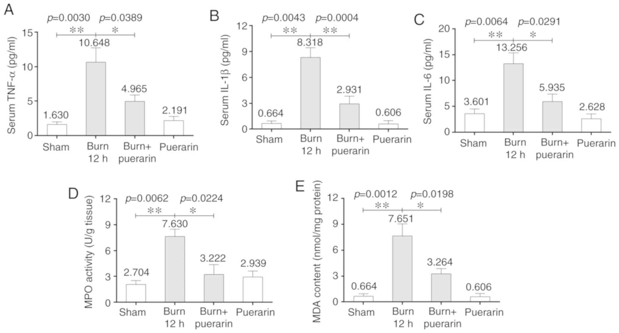 Interestingly, no differences were observed in any of the aforementioned parameters between the sham and puerarin only groups, suggesting that puerarin treatment did not produce adverse effects in animals that did not receive severe burns.