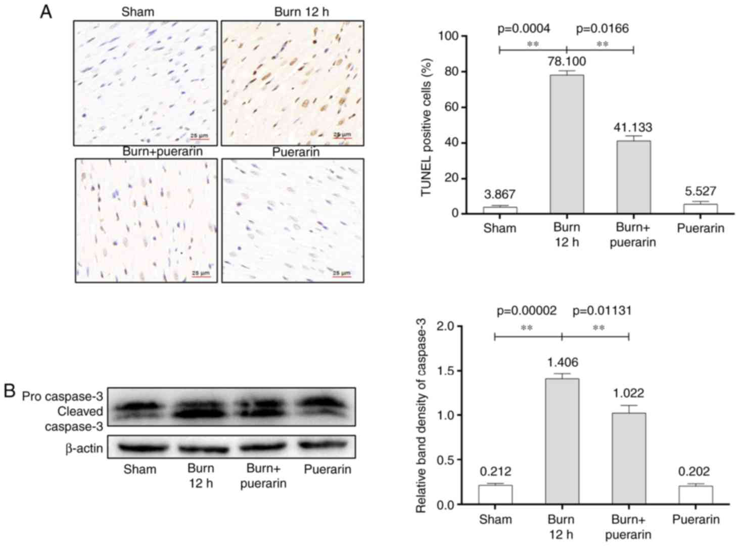 Cardiomyocyte apoptosis typically occurs within hours of burn injury, where previous studies have demonstrated that increased apoptotic rates may affect cardiac function (37). To evaluate the effect of puerarin on cardiac apoptosis, TUNEL staining was performed of myocardial tissue slices isolated from rats in each treatment group. Myocardial cell death was found to be significantly higher in the burn group compared with that in the sham group (Fig. 3A). Tissues isolated from rats in the burn + puerarin group demonstrated significantly reduced cardiomyocyte apoptosis compared with that in the burn group. Protein levels of cleaved caspase-3, a marker of apoptosis, was also revealed to be significantly increased in myocardial tissues isolated from rats in the burn group 12 h after burn injury compared with those in the Sham group (Fig. 3B). Cleaved caspase-3 levels were lower in the burn + puerarin group compared with that in the burn group (Fig. 3B).