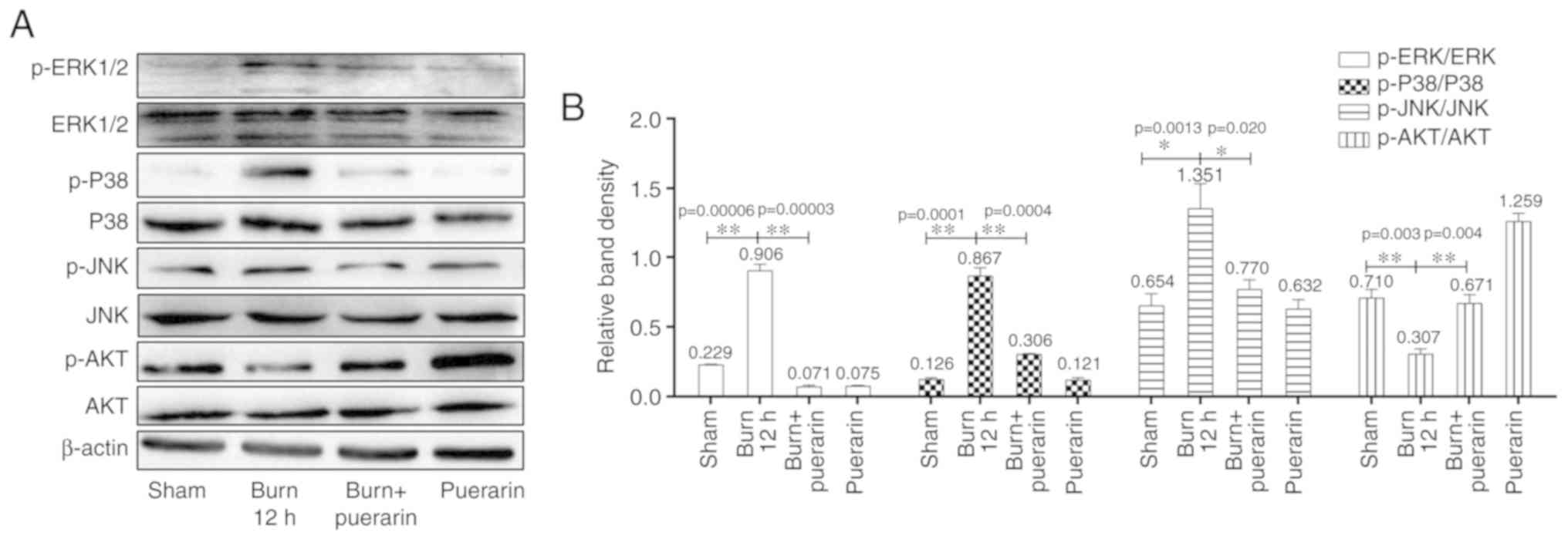 Although data presented in the present study provided evidence for the protective effects of puerarin against myocardial injury as a result of severe burn, the mechanism underlying the protective effects of puerarin remains poorly characterized. Since previous studies have demonstrated that burn injury promoted apoptotic signaling through the inhibition of Akt and activation of p38-MAPK (38,39), The effects of puerarin treatment on MAPK and Akt activation following burn-induced cardiomyocyte injury was next evaluated. Phosphorylation levels of p38, ERK and JNK were found to be significantly higher in the burn group compared with those in the Sham group at 12 h post-injury, whilst the opposite was observed in terms of Akt phosphorylation (Fig. 4). p38, ERK and JNK phosphorylation were found to be significantly lower in the burn + puerarin group compared with those in the burn group; but the opposite was observed for Akt phosphorylation (Fig. 4).