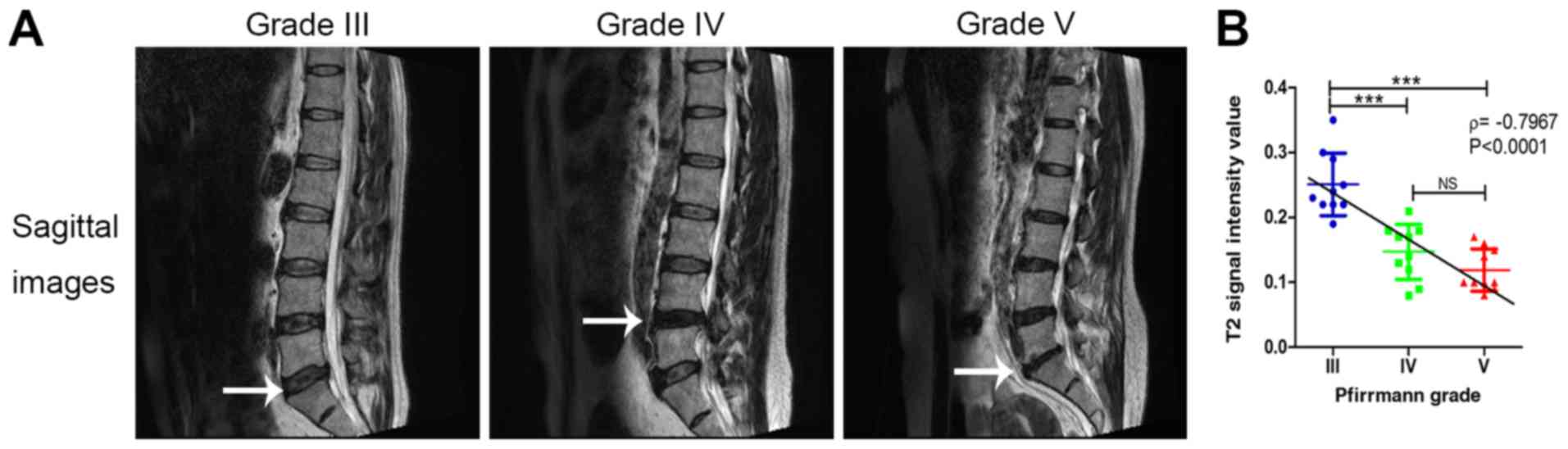 Representative MRI images of different patients are provided in Fig. 1A. The κ value of the first measurement was 0.734, indicating a good interobserver agreement (P<0.001) and the κ value of the second measurement was 0.774 (P<0.001). The grading results are listed in Table I: Grade III, n=10; grade IV, n=10; and grade V, n=10. None of the discs were graded as Pfirrmann grade I or II.