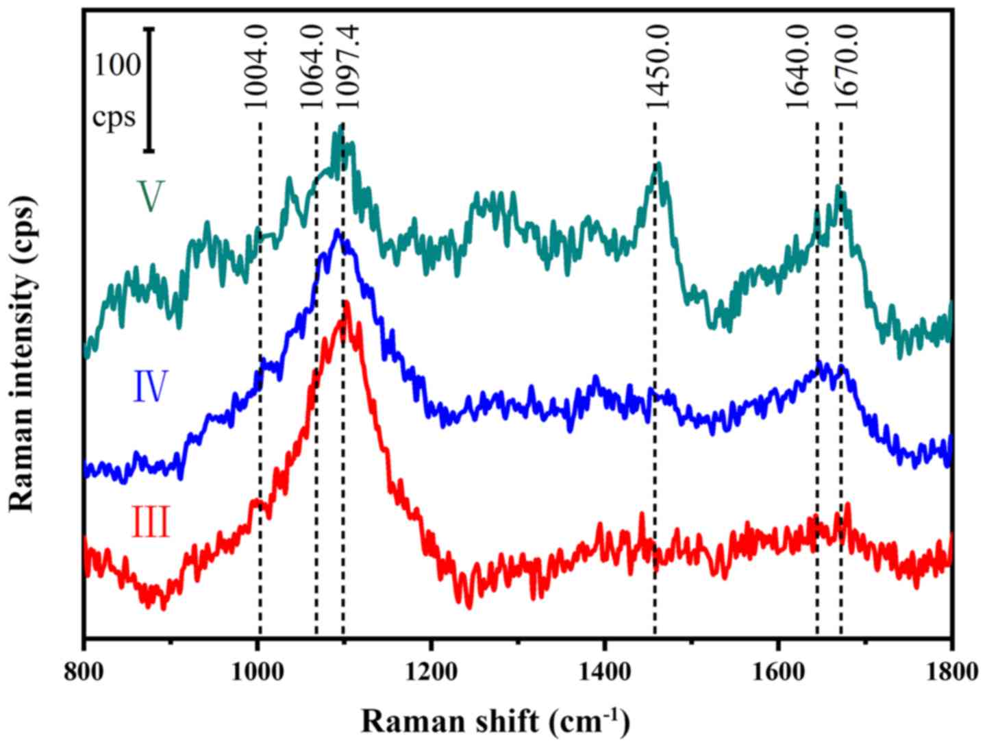 Raman spectroscopy, based on inelastic scattering of light, is an emerging optical technique (12). It is widely used in the fields of medicine and life sciences due to its advantages of being label-free, non-invasive and an objective diagnostic tool at the molecular level. The advantage of a label-free technique is the ability to provide important information on the unmodified target molecules (13-15). Raman spectroscopy is able to detect biological macromolecules, including proteins, lipids, and DNA in biological samples and it provides abundant molecular information at the microscopic level (16). In recent years, the significant developments in Raman spectroscopic technology have facilitated it becoming a research hotspot for the early stages of disease and intra-operative diagnosis (17,18).