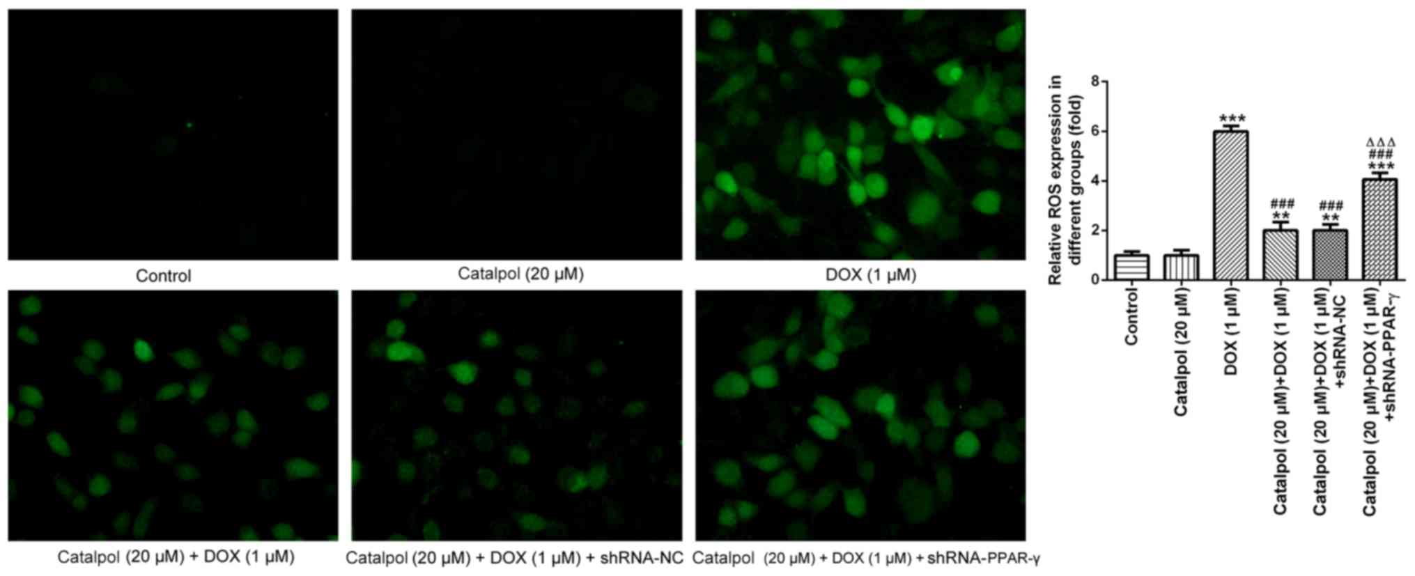 To further investigate ROS expression levels, DCF-DA staining was performed to detect the expression of ROS in H9C2 cells (Fig. 5). The fluorescence intensity in normal cardiomyocytes was generally weak with low ROS content. Following treatment with DOX for 24 h, the fluorescence intensity of the myocardial cells was enhanced and the fluorescence value was notably increased compared with the control group, indicating that the intracellular ROS content had increased. Compared with the DOX group, catalpol treatment significantly reduced the intracellular fluorescence intensity, the fluorescence value and the ROS content of H9C2 cells. However, the addition of shRNA-PPAR-γ significantly reversed catalpol-mediated downregulation of intracellular ROS content. These results indicated that catalpol treatment significantly reduced DOX-induced ROS production. Collectively, the results suggested that catalpol reversed DOX-induced inflammation and oxidative stress in H9C2 cells through PPAR-γ activation.