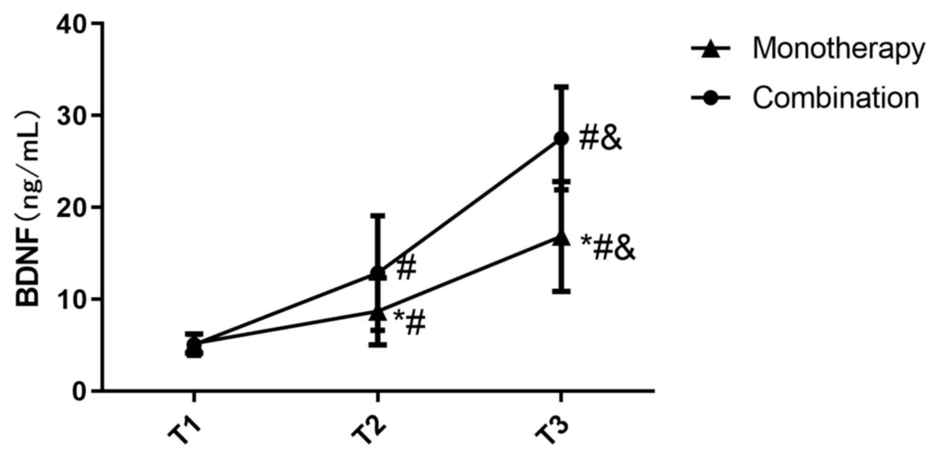 There was no significant difference in the BDNF levels between the two groups at T1 (Fig. 7). The BDNF levels in the combination group at T2 was 12.84±6.24, which was significantly higher compared with that in the monotherapy group (8.67±3.65; P<0.05; Fig. 7). The BDNF levels in the combination group at T3 was 27.52±5.61, which was also significantly higher compared with that in the monotherapy group (16.84±5.99; P<0.05; Fig. 7).