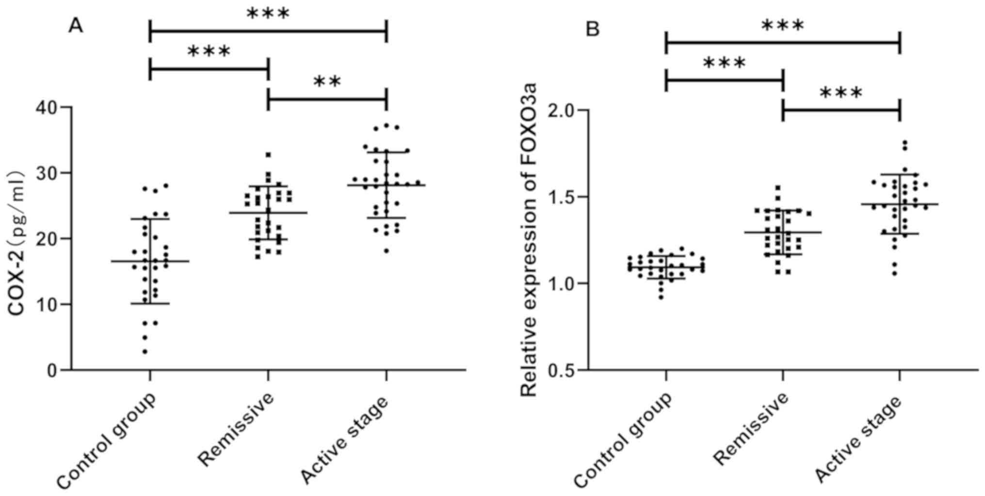 Main observational indices: The expression levels of serum COX-2 and FOXO3a in the control and study groups were observed. According to the DAS28 score, the patients were divided into active and remissive patients (≥2.6 points for active stage and <2.6 points for remissive stage), between whom the expression levels were compared.