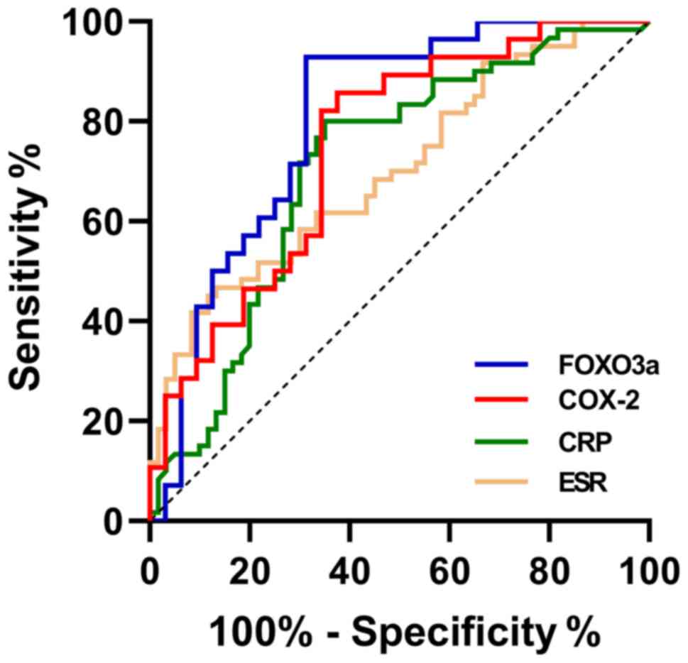 According to the ROC curves, the area under the curve (AUC) of COX-2 was 0.748. When the specificity was 62.50% and the sensitivity was 85.71%, the best cut-off value of COX-2 was 27.671 pg/ml. The AUC of FOXO3a was 0.802. When the specificity was 68.75% and the sensitivity was 92.85%, the best cut-off value of FOXO3a was 1.424. The AUC of CRP was 0.708. When the specificity was 80.00% and the sensitivity was 65.00%, the best cut-off value of CRP was 7.25 mg/l. The AUC of ESR was 0.702. When the specificity was 86.67% and the sensitivity was 46.67%, the best cut-off value of ESR was 14.85 mm/h (Table II and Fig. 2).