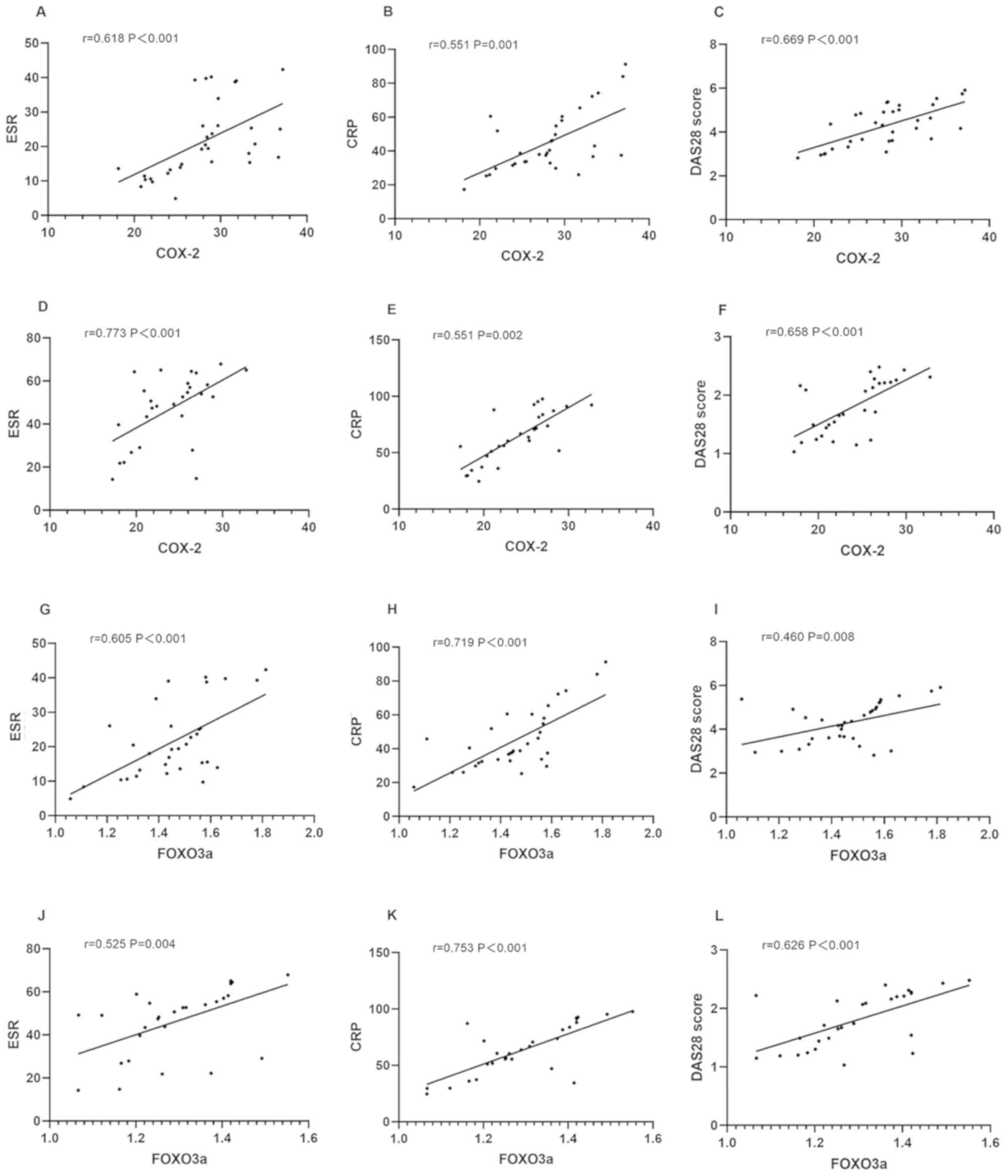 Therefore, the expression levels of FOXO3a and COX-2 and their correlation with the disease activity of patients with RA were explored in this study to provide new targets for the treatment of the disease.