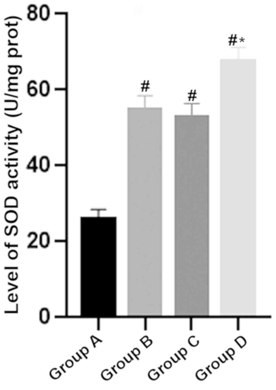SOD activity of the four groups. SOD activity in groups A, B, C and D was 26.05±2.46, 54.67±3.87 52.67±3.76 and 67.67±3.57 U/mg, respectively. SOD activity in group A was significantly lower than that in groups B, C and D (P<0.05), while that in group D was significantly higher than that in groups B and C (P<0.05). There was no difference between group B and C (P>0.05) (Fig. 1).