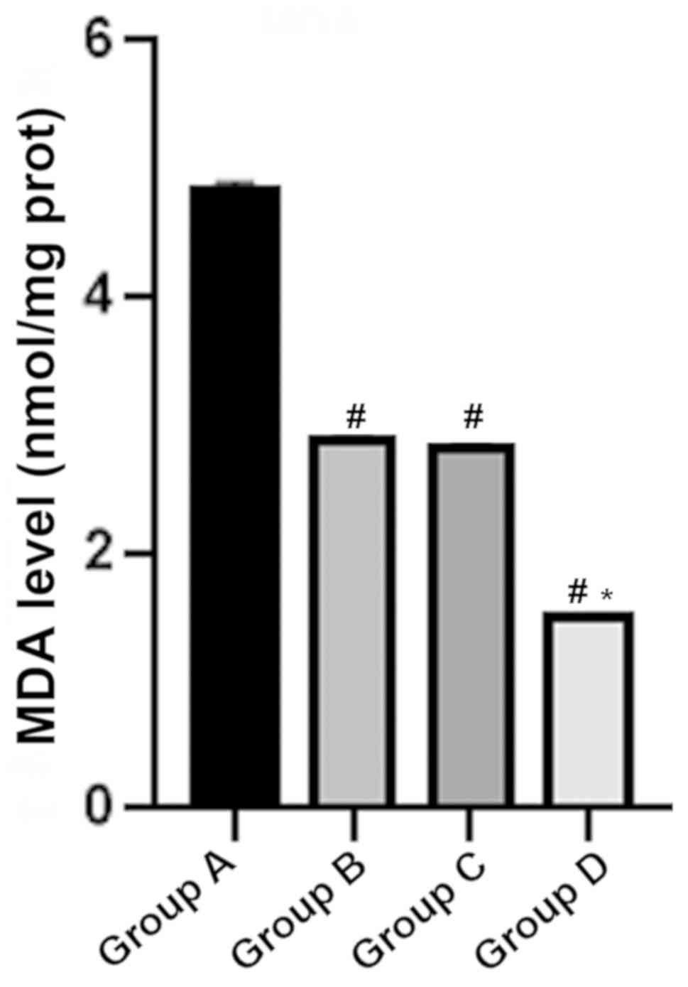 MDA content in the four groups. MDA content in groups A, B, C and D was 4.83±0.07, 2.88±0.05, 2.82±0.06 and 1.49±0.04 nmol/mg, respectively. The MDA content in group A was significantly higher than that in groups B, C and D (P<0.05), while the MDA content in group D was significantly lower than that in groups B and C (P<0.05). There was no difference between group B and C (P>0.05) (Fig. 2).