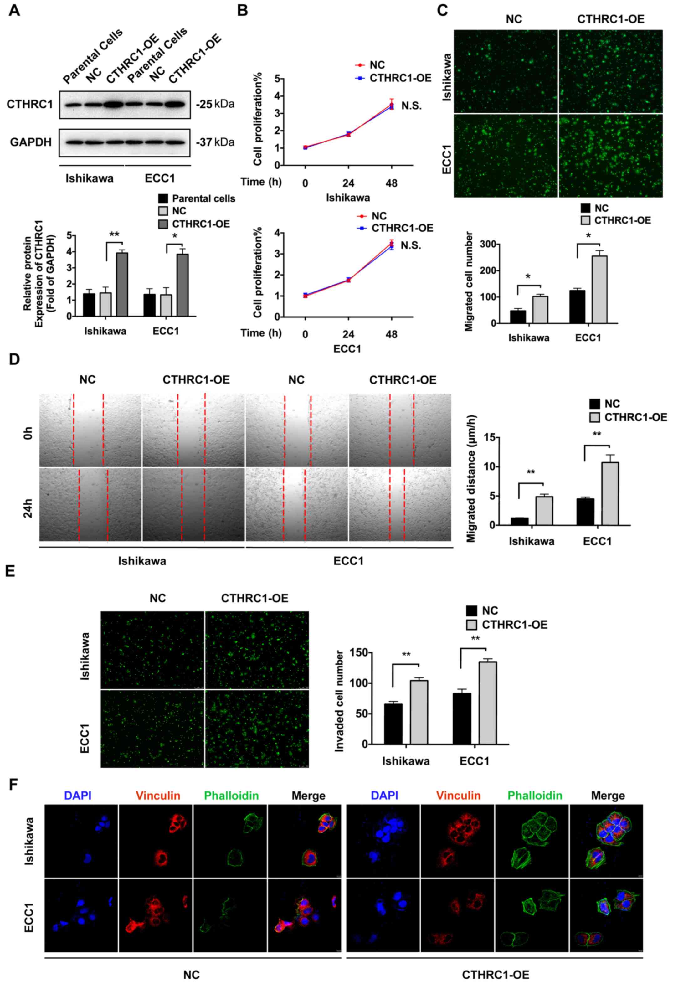 To explore the effect of CTHRC1 on EC, CTHRC1 was overexpressed in Ishikawa and ECC1 cells. CTHRC1 expression was analyzed by western blotting (Fig. 2A). CCK-8 assay was performed to investigate the proliferative ability of Ishikawa and ECC1 cells. There was no significant difference in proliferation between the NC cells and CTHRC1-OE cells in both Ishikawa and ECC1 cell lines (Fig. 2B). To explore the role of CTHRC1 on the migration of Ishikawa and ECC1 cells, Transwell migration assays were performed. As shown in Fig. 2C, compared with cells transfected with the empty vector, migration was significantly increased in the CTHRC1-OE cells. In addition, the relationship between CTHRC1 and cell migration was investigated by wound healing assays. The results demonstrated that cells in the CTHRC1-OE group showed more rapid wound closure ability compared with the NC group (Fig. 2D). Transwell invasion assays revealed that invasion was significantly increased in the CTHRC1-OE cells compared to the NC cells (Fig. 2E). Cells were stained for vinculin, a focal adhesion protein, and with phalloidin, a cytoskeletal protein dye, to display the focal adhesion and cytoactin remodeling. Confocal immunofluorescence staining revealed weaker vinculin and stronger phalloidin staining in CTHRC1-OE cells compared with the NC (Fig. 2F). These results indicated that overexpression of CTHRC1 could promote the migration of EC cells. However, there was no significant influence on cell proliferation in vitro.