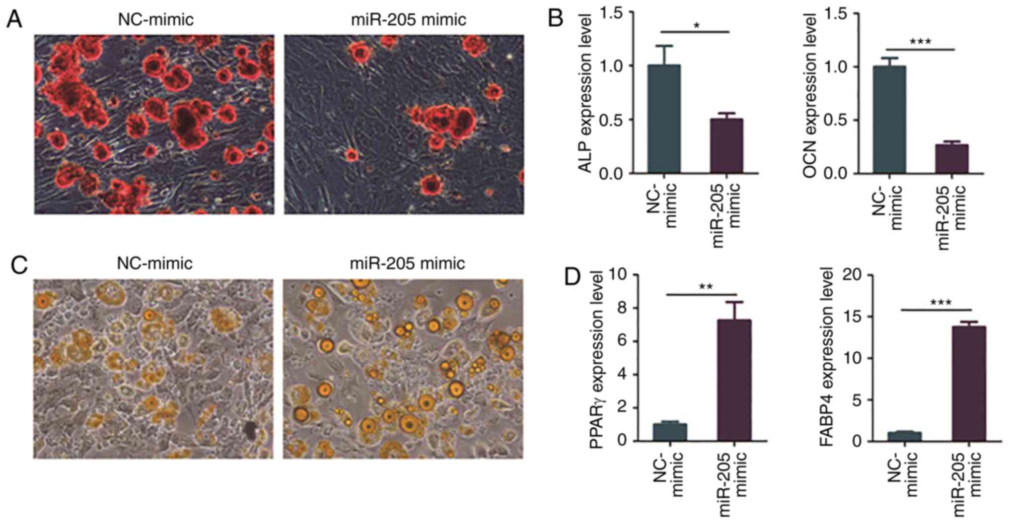 In addition, the third-generation BMSCs in the logarithmic growth phase were inoculated into a 24-well plate and transfected with miR-205. Then adipogenic induction medium containing 1 µM of dexamethasone, 200 µM of indometacin, 0.5 mM of IBMX and 10 µM of insulin for adipogenic induction for 24 days, and the original medium was replaced with the fresh medium once every 3 days. After that, oil red O (ORO) staining was performed. First, the induction medium was discarded, and the cells were washed with PBS 3 times, fixed with 4% paraformaldehyde at room temperature for 30 min, stained with ORO dye (Cyagen) for 30 min and washed again with PBS, followed by observation under the inverted microscope (magnification, x10).