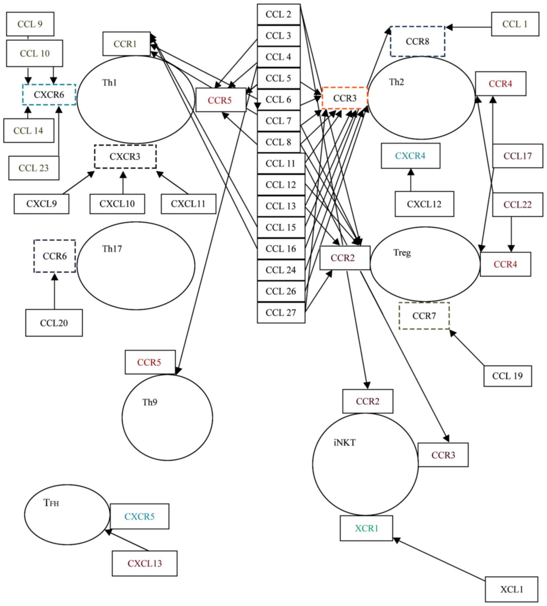 Besides this known relationship between Th2 lymphocytes and presented chemokines, a number of studies pointed out the association of other CC and Th2 cells in the pathogenesis of respiratory allergic diseases. For instance, in the last decades, numerous studies focused on the investigation on CCL2 [monocyte chemoattractant protein-1 (MCP-1)], CCL5 (RANTES-regulated on activation, normal T cell expressed and secreted), CCL7 [monocyte-chemotactic protein-3 (MCP-3)], CCL13 [monocyte-chemotactic protein-4 (MCP-4)] and CX3CL1 (Fraktaline) regarding their association with inflammation in asthma and AR.
