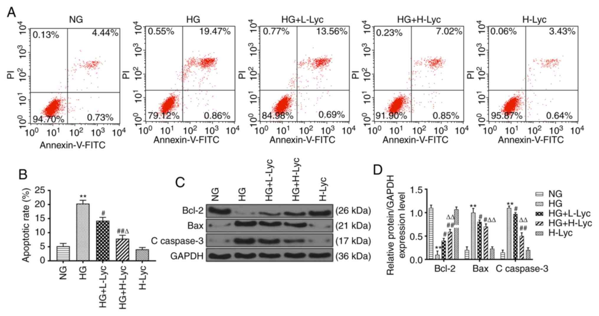 Although the effects of Lyc on podocyte injury and apoptosis have attracted increasing attention, the exact mechanism underlying how Lyc exerts its protective effect on HG-induced podocyte apoptosis is not completely understood. Therefore, the present study explored the protective effect of Lyc on HG-induced MPC5 podocyte apoptosis and the underlying mechanism.