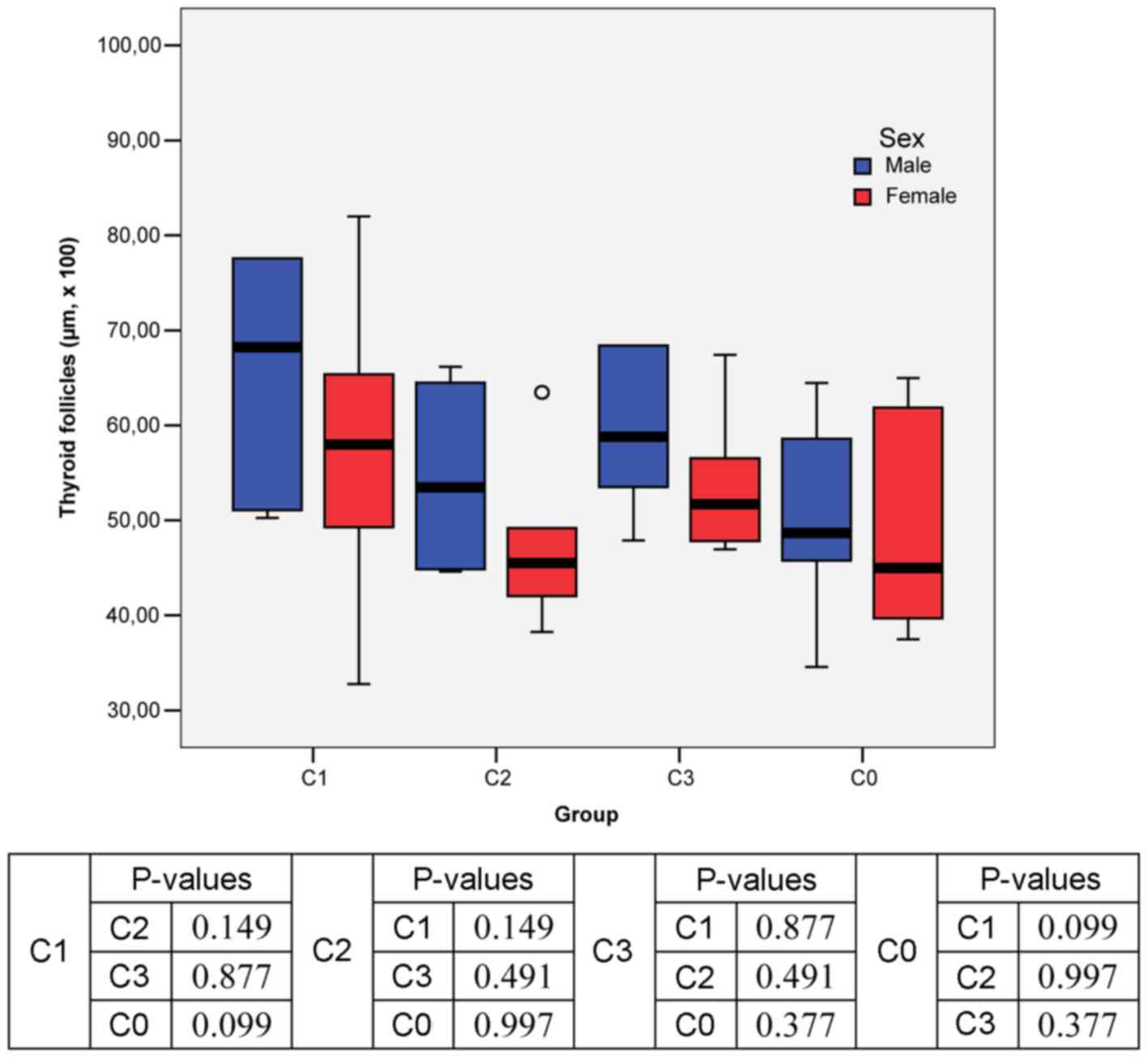 Two-way ANOVA results showed statistically significant differences in the mean size of thyroid follicular epithelium analyzed by sex and intervention group only between C1 (only KI adminsitration) and C2 (concomitant KI and sodium selenite administration) groups (Fig. 2).