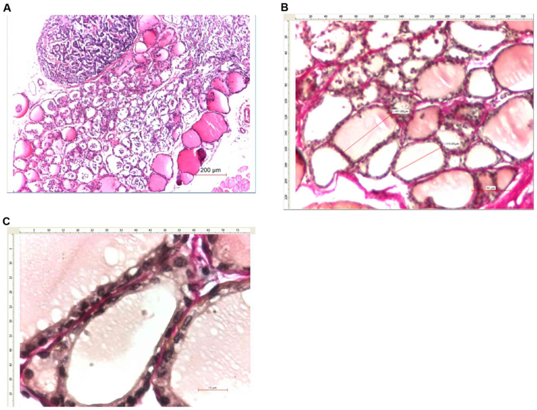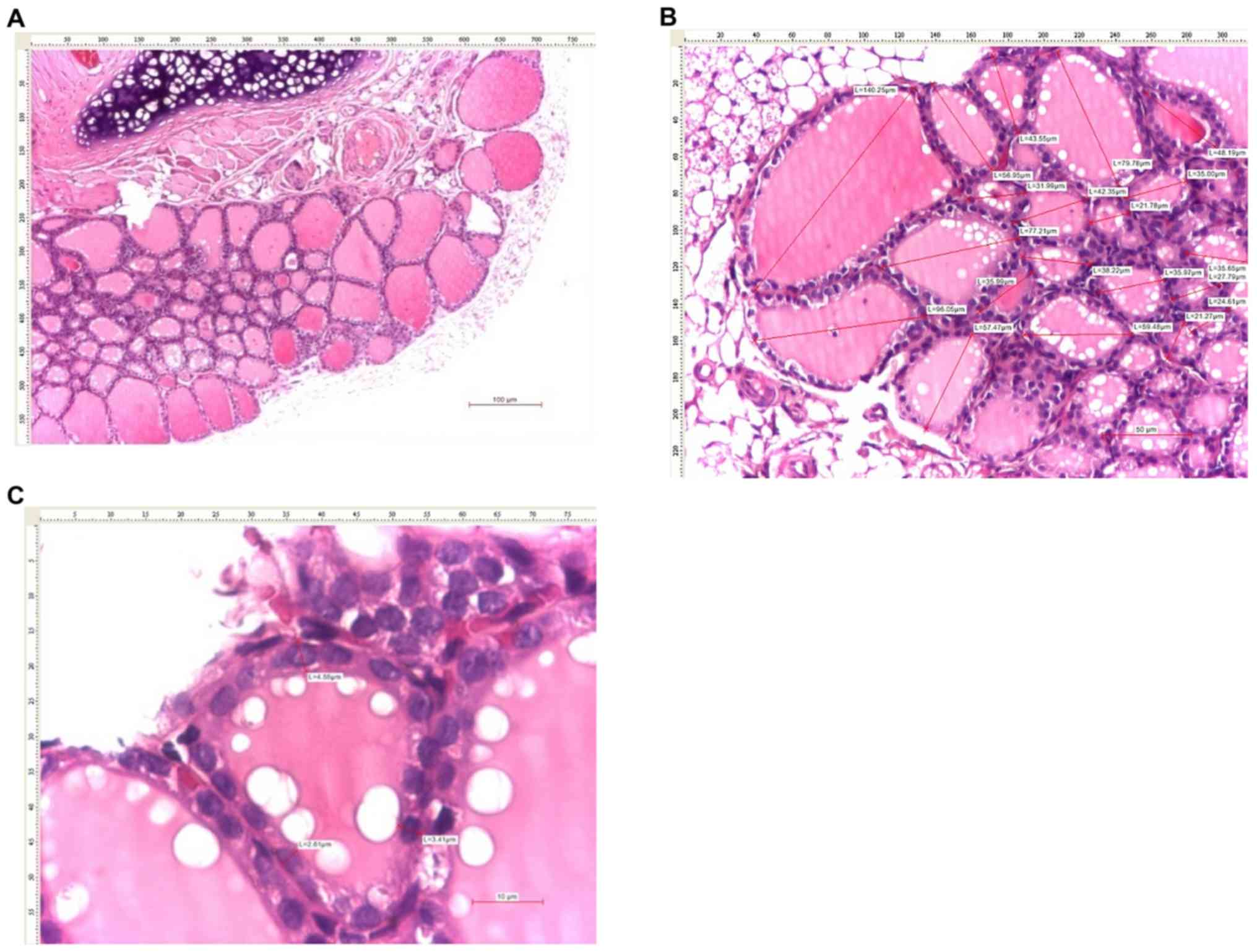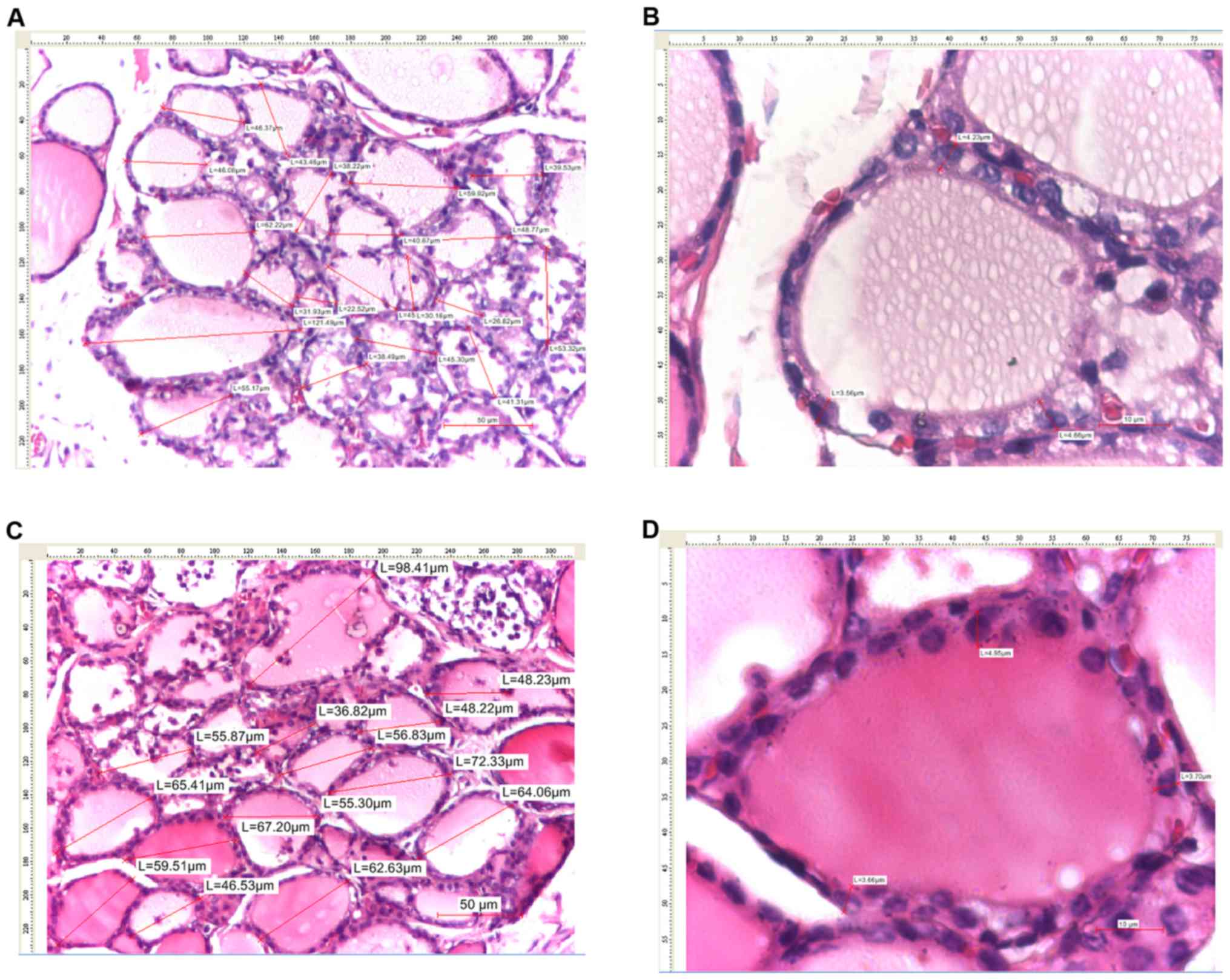The mean size of thyroid follicles was assessed by measuring the maximum diameter of ≥20 thyroid follicles per case in various areas of the thyroid gland. The mean size of the thyroid follicular epithelium was assessed by measuring the size of the follicular epithelium in fixed positions (at 12, 5 and 7 o'clock) in 20 follicles per case.