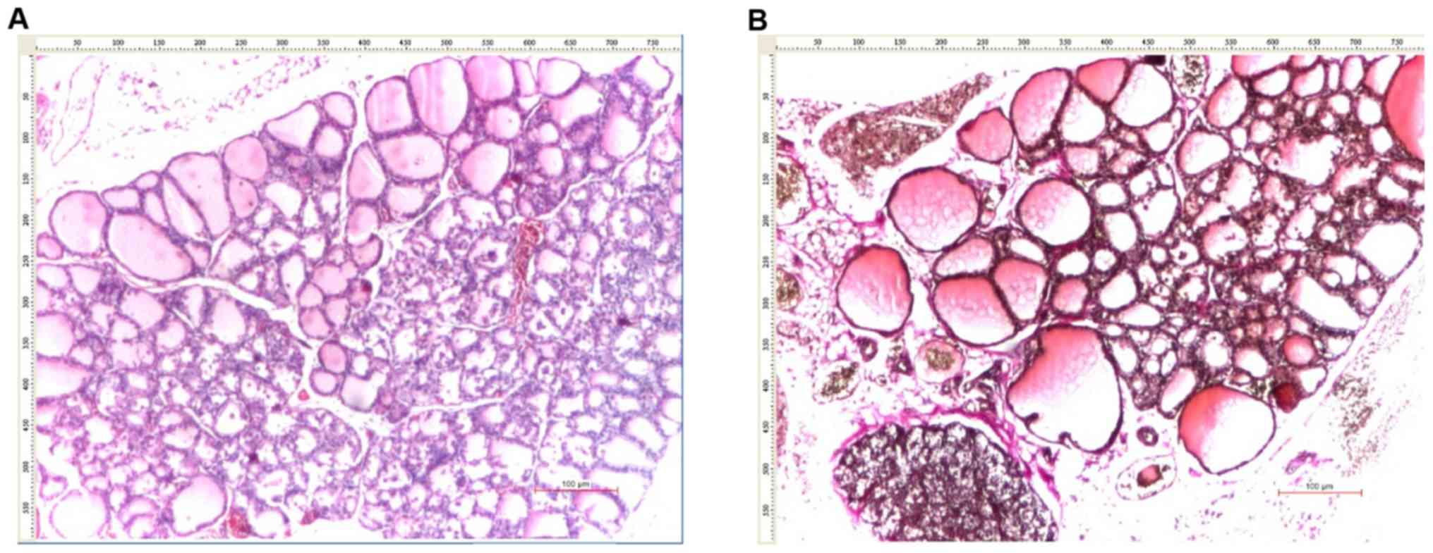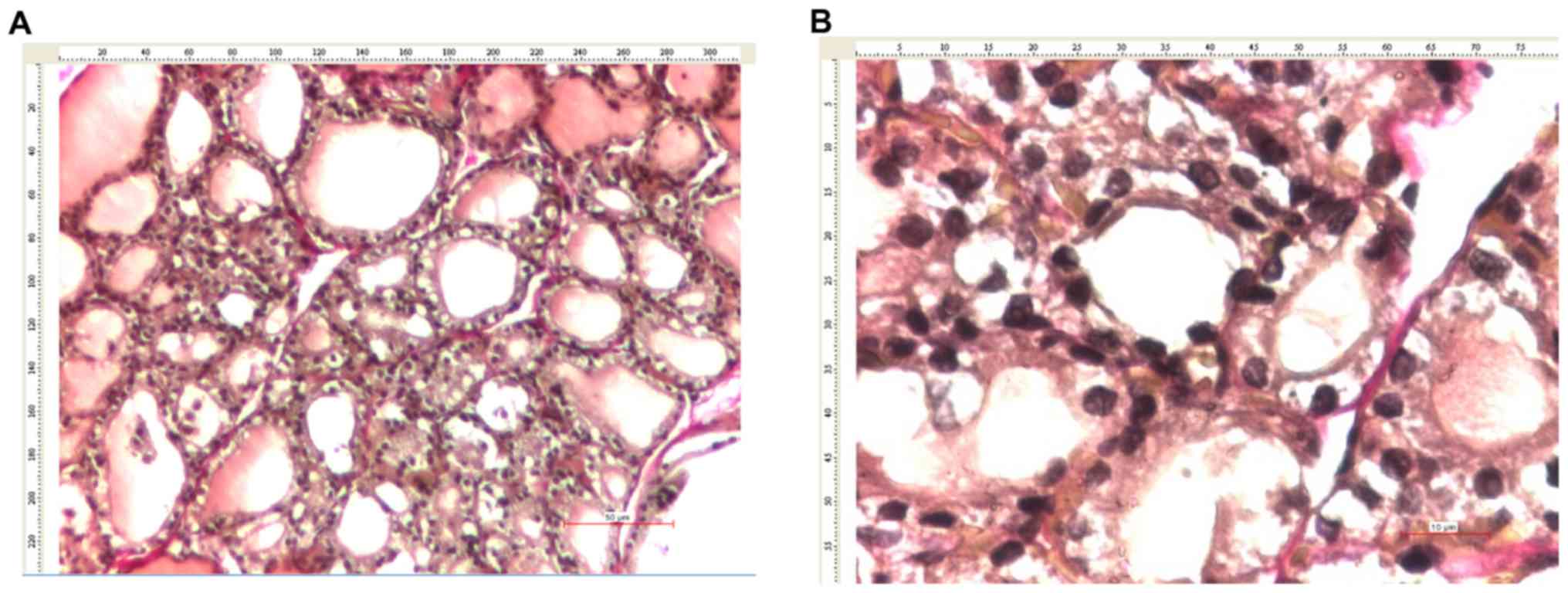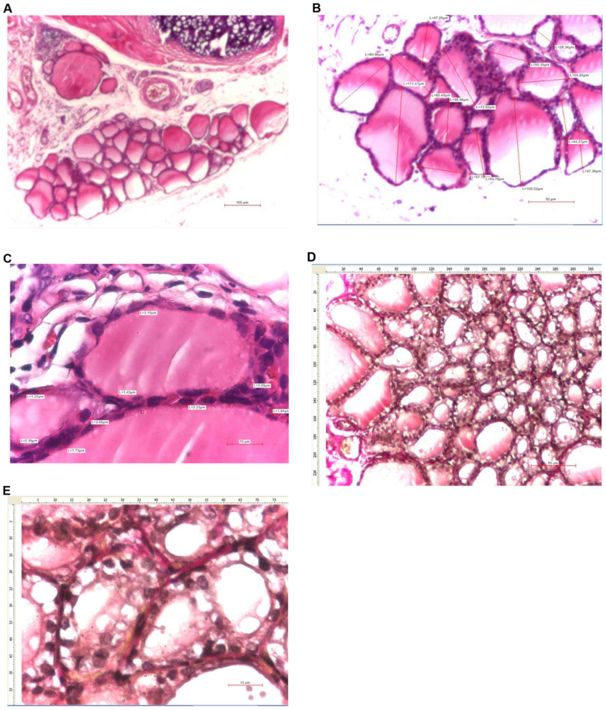 The mean size of thyroid follicles was assessed by measuring the maximum diameter of ≥20 thyroid follicles per case in various areas of the thyroid gland. The mean size of the thyroid follicular epithelium was assessed by measuring the size of the follicular epithelium in fixed positions (at 12, 5 and 7 o'clock) in 20 follicles per case.