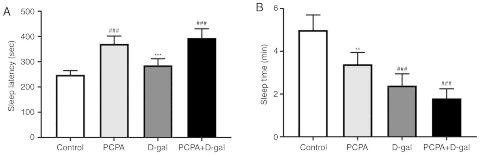 The sleep time of D-gal and PCPA+D-gal rats was significantly shorter compared with the control group (Fig. 3B). Additionally, PCPA rats exhibited longer sleep time compared with the PCPA+D-gal group (Fig. 3B). There was no significant difference between the PCPA and D-gal groups (Fig. 3B).