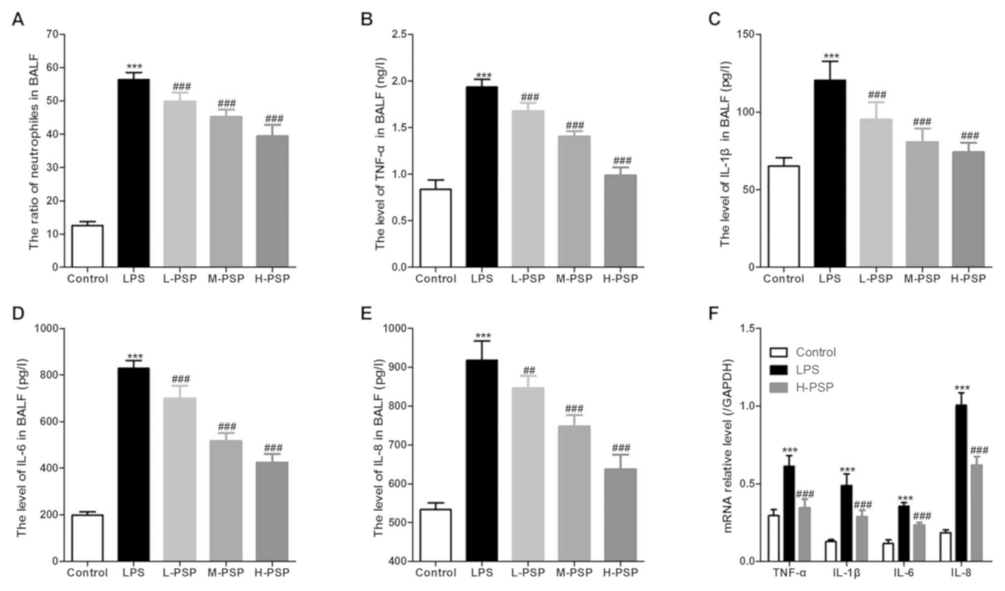 Excessive or uncontrolled inflammation is an underlying cause of ALI, and neutrophils play an important role in associated dynamics. Thus, we used BALF tests to assess measures of lung inflammation in the different treatment groups of rats, and found that PSPs were able to attenuate LPS-induced increases in neutrophil ratios (Fig. 2A) and attenuated levels of inflammatory factors in BALF (Fig. 2B-E). Moreover, PSPs were able to reduce LPS-induced increases in mRNA expression of inflammatory factors in lung tissues of the ALI-afflicted rats (Fig. 2F).
