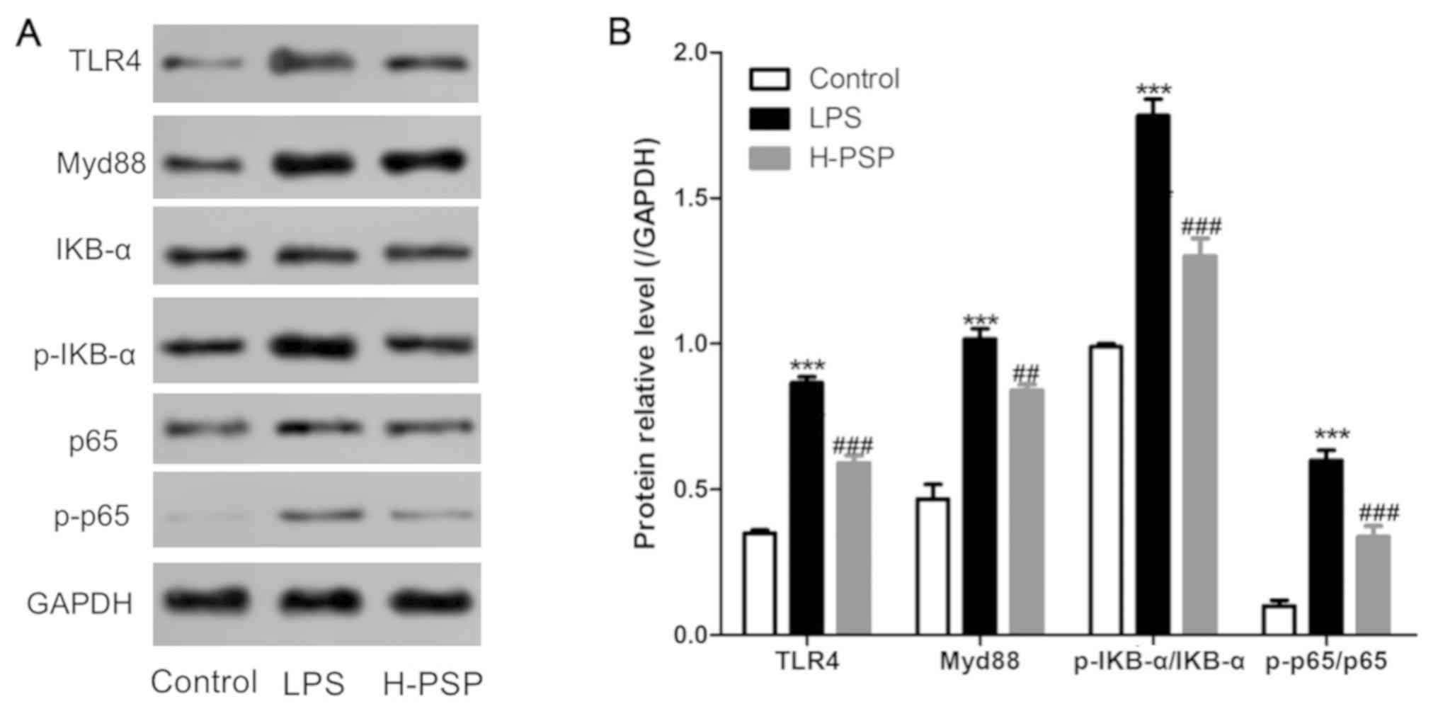 The TLR4/NF-κB pathway is known to be closely related to the dynamics of LPS-induced inflammation. Thus, we measured the expression levels of key proteins in the TLR4/NF-κB pathway by using western blotting. As shown in Fig. 3, LPS was able to induce elevated levels of TLR4, Myd88, p-IKB-α/IKB-α, and p-p65/p65 proteins in lung tissue of ALI afflicted rats. In contrast, the expression levels of TLR4, Myd88, p-IKB-α/IKB-α, and p-p65/p65 proteins in lung tissue of the H-PSP rat treatment group were significantly decreased when compared with the levels in the LPS treatment group (Fig. 3).