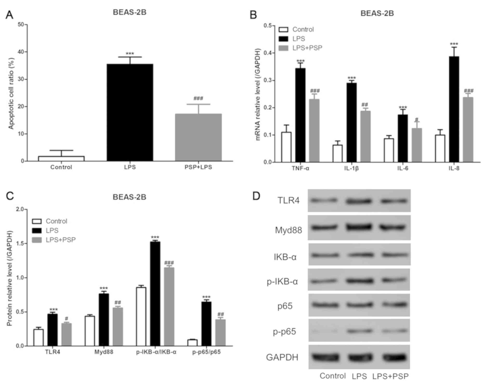 In theory, regarding the underlying dynamics of inflammatory effects upon ALI, LPS enters the body and is recognized by lipopolysaccharide-binding protein (LBP), and then binds to cluster of differentiation 14 (CD14) to form the LPS/LBP/CD14 complex, which can induce inflammation through multiple signal transduction pathways to ultimately release a large amount of inflammation factors. This release causes lung damage, of which TLR4/Myd88/NF-κB is one of the most critical pathways (31,32). Our results also indicated that PSPs decreased LPS-induced increases in mRNA expression of inflammatory factors, and of TLR4, Myd88, p-IKB-α/IKB-α and p-p65/p65 proteins in lung tissue. In vitro, we found that PSPs could reduce apoptosis induced by LPS in BEAS-2B cells by inhibiting inflammation via limiting the TLR4/Myd88/NF-κB pathway.