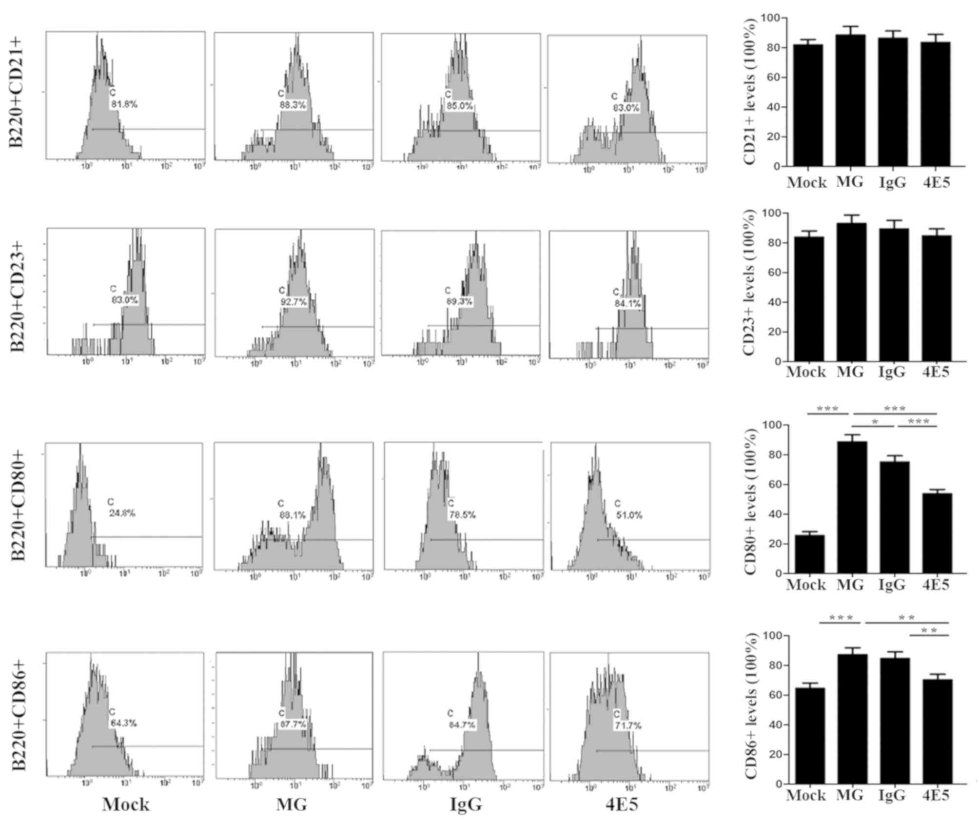 Folzenlogen D, Hofer MF, Leung DY, Freed JH and Newell MK: Analysis of CD80 and CD86 expression on peripheral blood B lymphocytes reveals increased expression of CD86 in lupus patients. Clin Immunol Immunopathol. 83:199–204. 1997.PubMed/NCBI View Article : Google Scholar