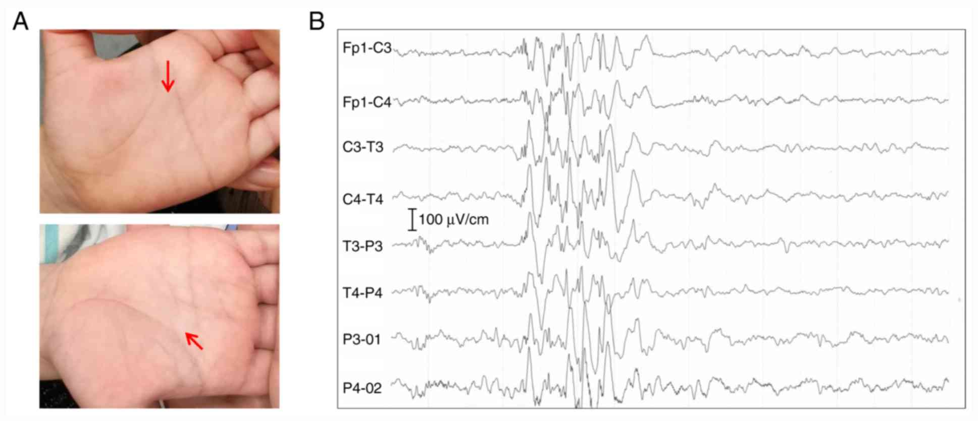 The patient was a 22-month-old Chinese boy [height, 88 cm (+0.2 SD); weight, 11.5 kg (-0.7 SD); head circumference, 45 cm (-2.3 SD)] who was the second child born at full term via cesarean section to physically healthy and nonconsanguineous Chinese parents. He was admitted to Department of Pediatric Internal Medicine of Fujian Maternity and Child Health Hospital (Fuzhou, China) for a comprehensive examination in March 2019. The patient presented with recurrent epileptic spasms at a frequency of 1-3 times/day for 2-3 days/week since he was 1 year old. Coronal magnetic resonance imaging from Department of Pediatrics, Nanping People's Hospital (Nanping, Fujian) revealed white matter plaques, a small frontal lobe and myelin dysplasia. Physical examination identified truncal hypotonia and bilateral single transverse palmar creases (Fig. 1A), and the electroencephalogram reported typical epileptoid discharge (Fig. 1B). The patient was diagnosed with intractable epilepsy and infantile spasm. The gross and fine motor development of the patient was significantly delayed compared with his peers. The patient could sit with support; however, he was unable to stand alone or speak. Infections by the Epstein-Barr virus or cytomegalovirus were ruled out. No abnormalities were reported using abdominal ultrasound or ophthalmic examination. The 12-year-old sister of the patient did not exhibit the aforementioned features.