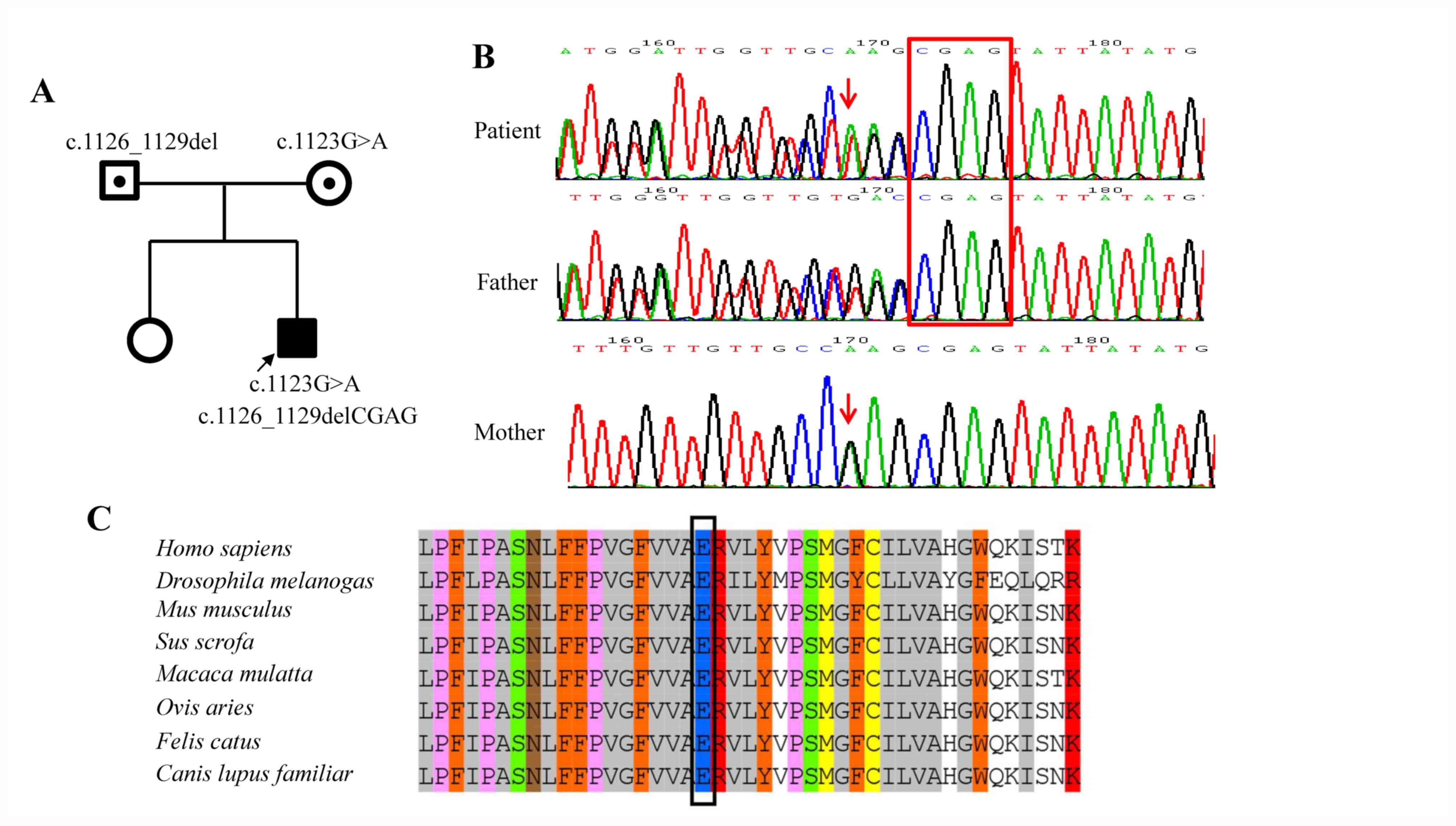 After sequencing, several types of in silico tools were applied to assess the pathogenicity of the Glu375Lys variant. The functional prediction of the identified variant was analyzed with MultAlin online software (multalin.toulouse.inra.fr/multalin) (9), CADD online software (version no. 1.6; cadd.gs.washington.edu), PROVEAN (version no. 1.1; provean.jcvi.org), MutationTaster online software and PolyPhen-2 online software (version no. 2; genetics.bwh.harvard.edu/pph2).